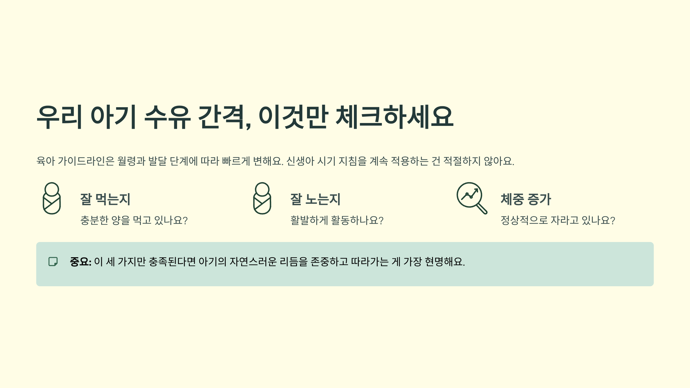 정말 중요한 건 아기가 잘 먹고, 잘 놀고, 체중이 정상적으로 증가하고 있는지예요. 이 세 가지만 충족된다면 아기의 자연스러운 리듬을 존중하고 따라가는 게 가장 현명해요.