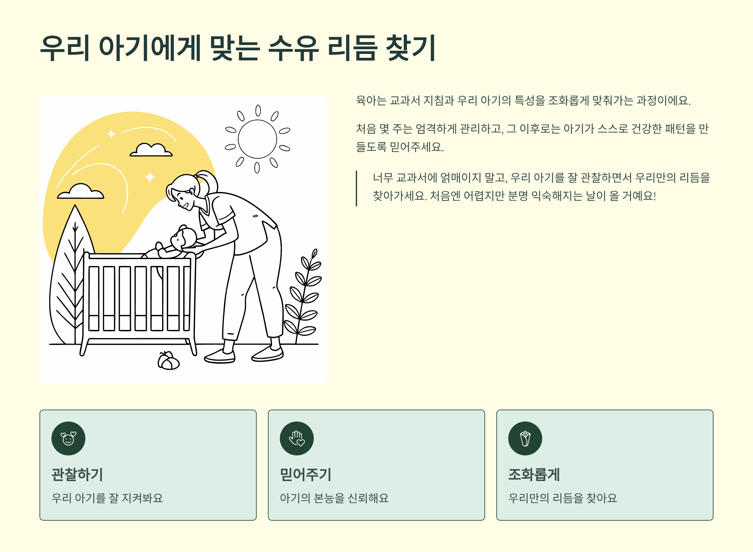 너무 교과서에 얽매이지 말고, 우리 아기를 잘 관찰하면서 우리만의 리듬을 찾아가세요. 처음엔 어렵지만 분명 익숙해지는 날이 올 거예요!