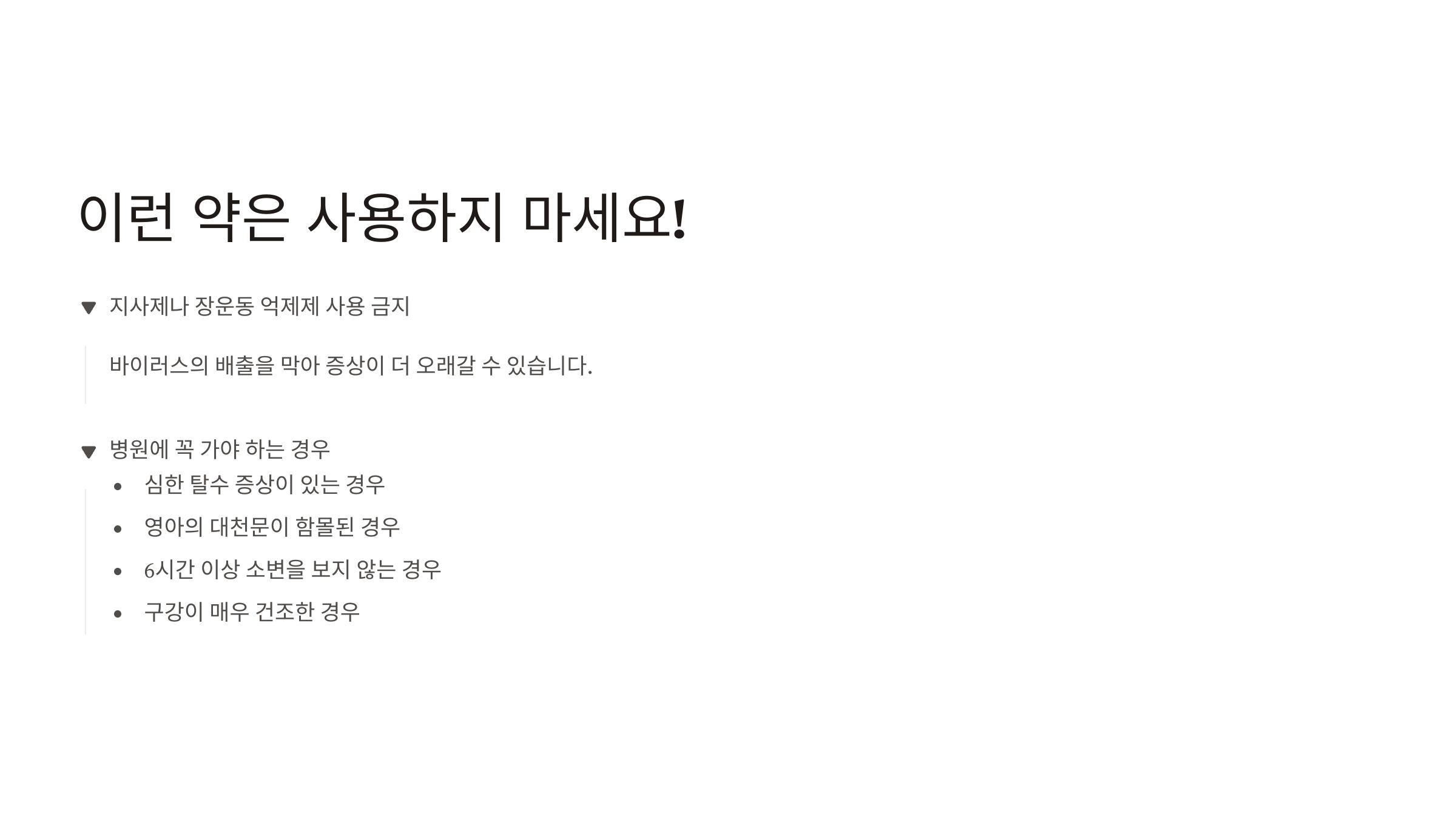 지사제나 장운동 억제제는 바이러스의 배출을 막아 증상이 더 오래갈 수 있으므로 의사와 상담 없이 사용하지 않는 것이 좋아요.