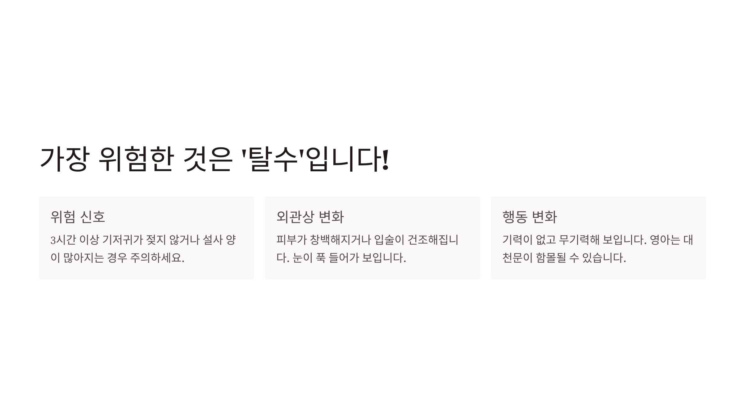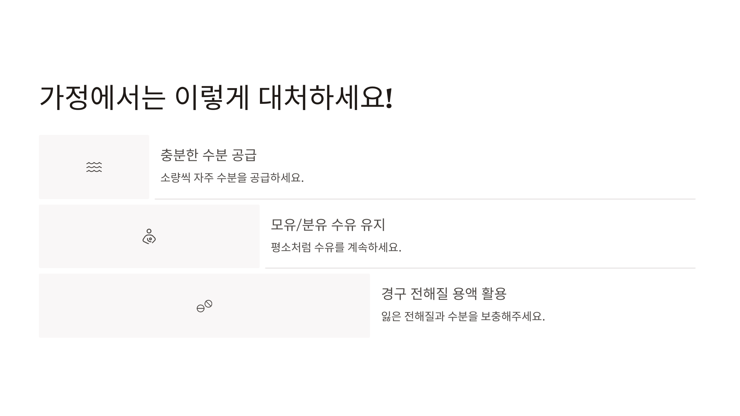 - 설사와 구토로 인한 탈수 방지가 가장 중요해요