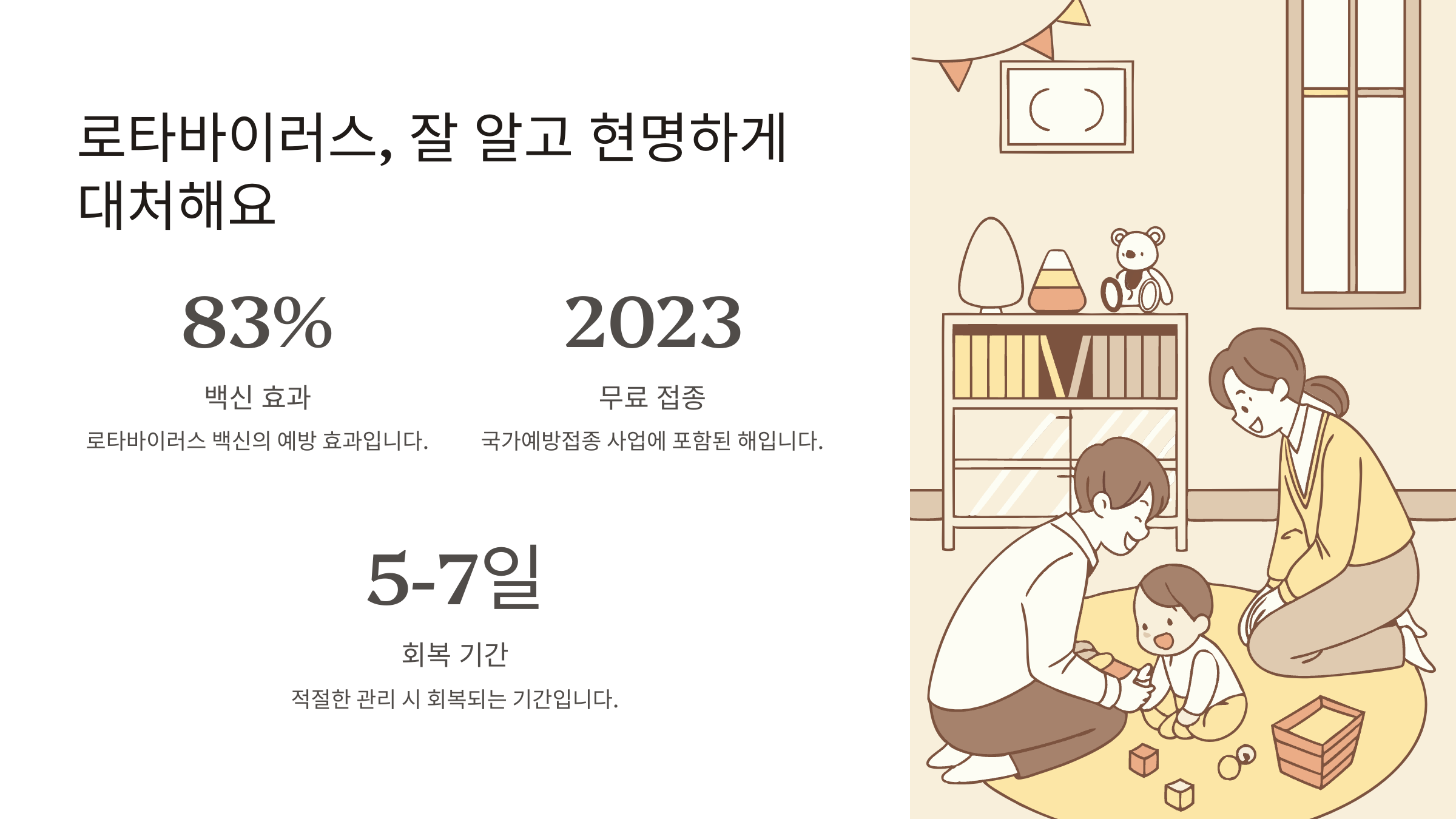 특히 2023년 3월부터 로타바이러스 백신이 국가예방접종에 포함되어 무료로 접종받을 수 있게 되었으니, 적절한 시기에 아이의 백신 접종을 완료하는 것이 좋겠죠? 그리고 탈수 증상이 심해 보이면 주저하지 말고 바로 병원을 찾아 적절한 치료를 받는 것도 잊지 마세요!