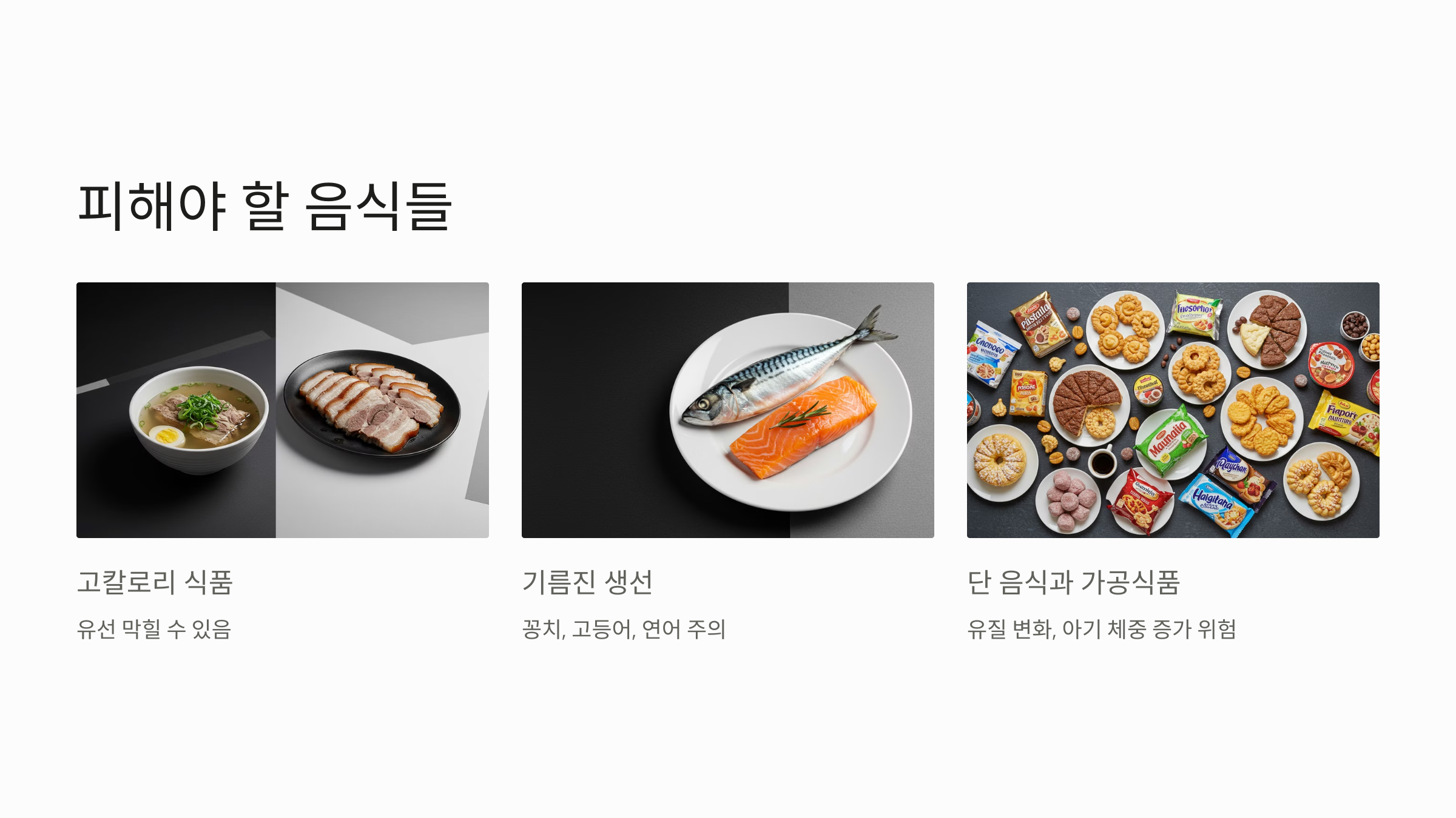 - 단 음식과 가공식품: 떡, 빵, 과자, 초콜릿, 케이크, 카레, 튀김류, 인스턴트 식품은 피하는 게 좋아요.