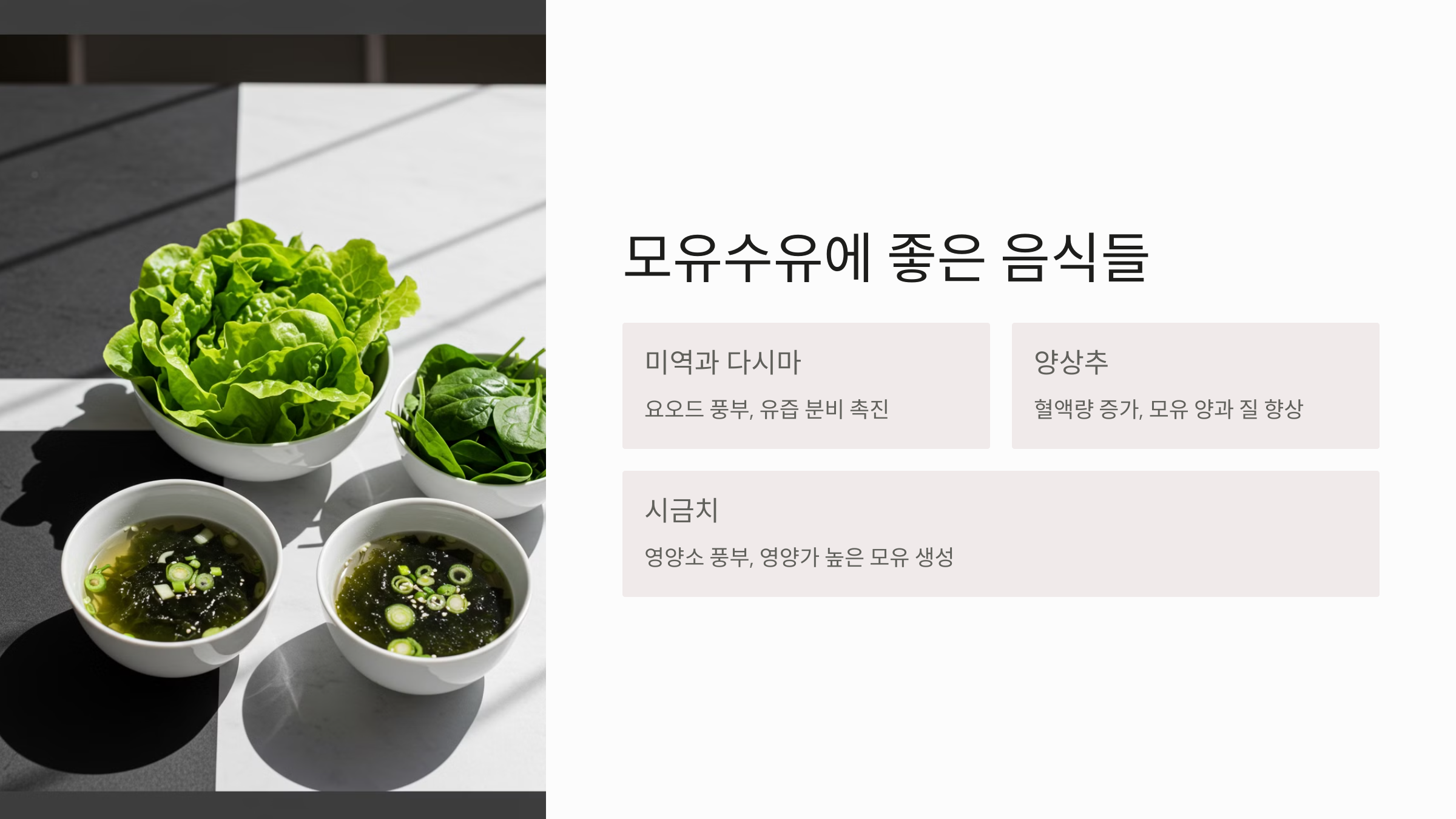 - 미역과 다시마: 요오드가 풍부해 유즙 분비를 돕고 신진대사를 활발하게 해줘요. 미역국은 소고기보다 해산물(조갯살, 바지락, 홍합, 굴)을 넣어 드시면 더 담백하고 유질에도 좋아요.