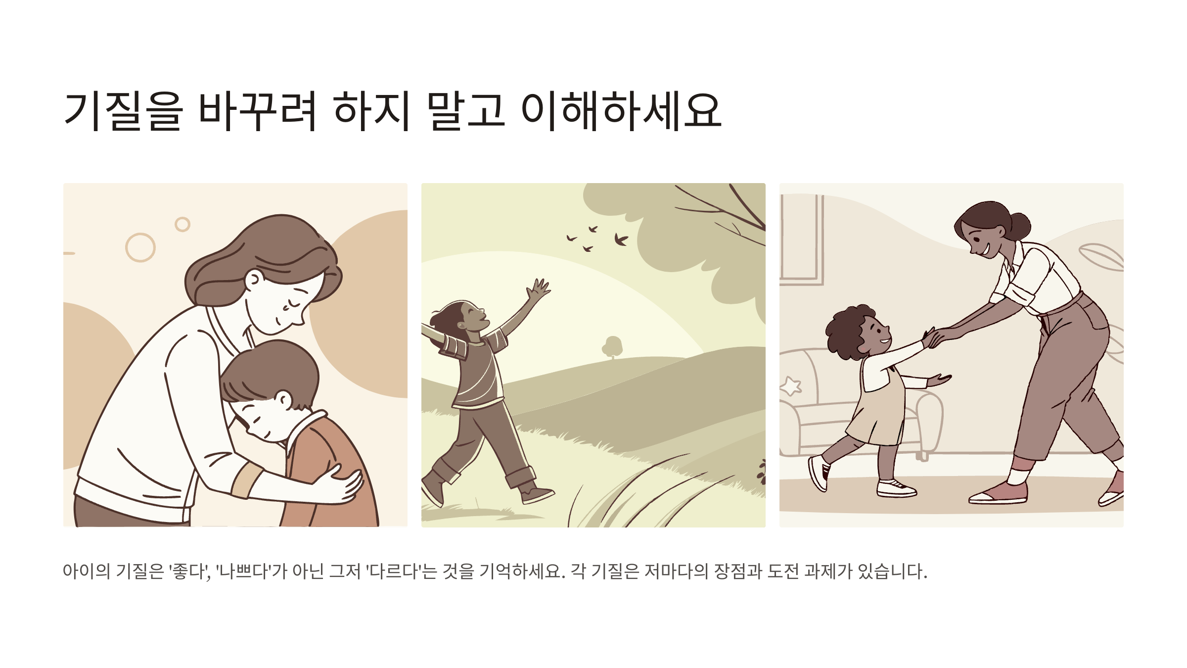아이의 기질은 '좋다', '나쁘다'가 아닌 그저 '다르다'는 것을 기억해주세요. 기질 자체를 바꾸려 노력하기보다는 아이의 고유한 특성을 이해하고 그에 맞는 환경을 제공하는 것이 중요합니다.