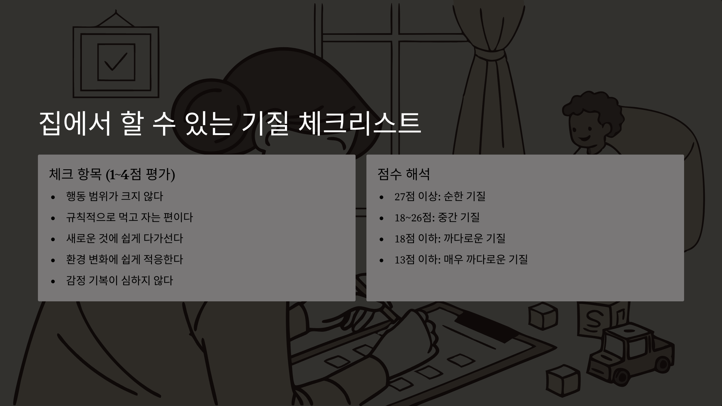 아이의 기질을 파악하는 방법은 다양해요. 전문 검사를 받을 수도 있고, 집에서 간단한 체크리스트로 확인할 수도 있답니다.