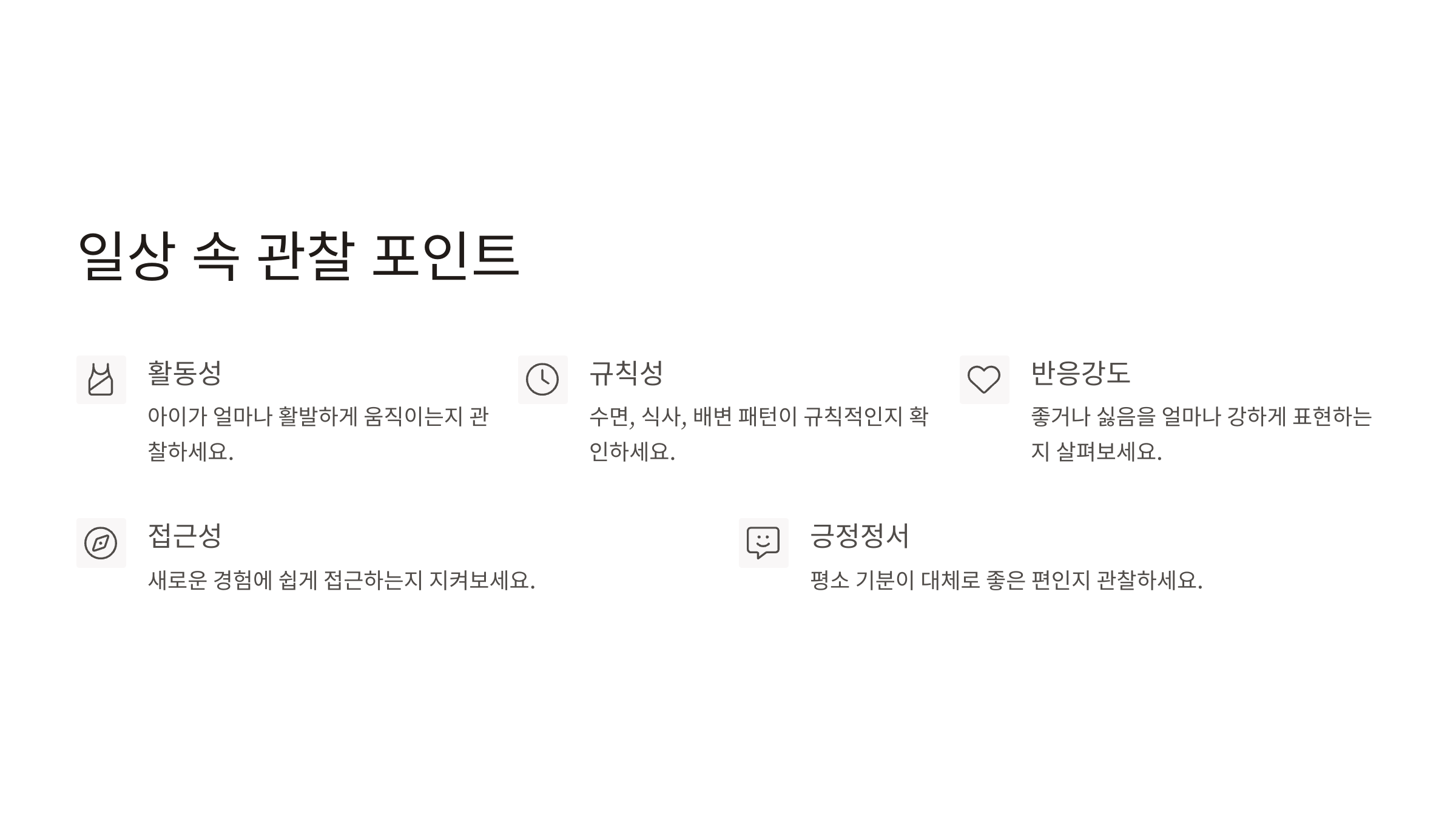 아이를 관찰할 때 다음 다섯 가지에 주목해보세요: