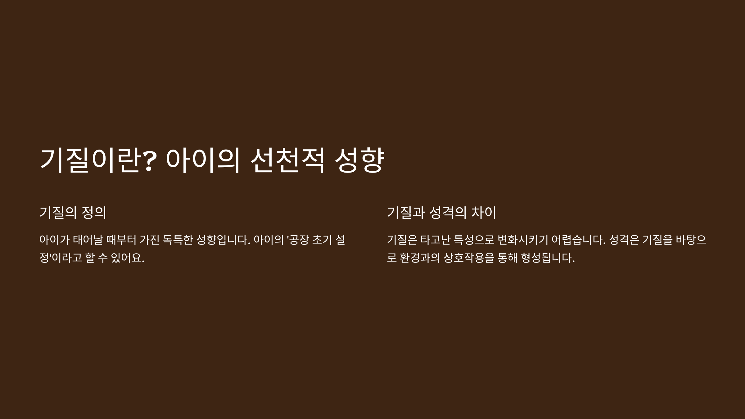 기질은 아이가 태어날 때부터 가지고 있는 독특한 성향을 말합니다. 쉽게 말해 아이의 '공장 초기 설정'이라고 할 수 있죠. 유전적 요소에 기반하며, 아이가 세상에 반응하는 방식을 결정합니다.