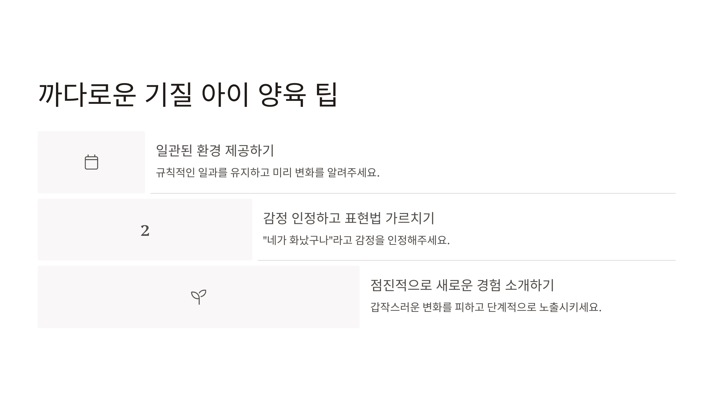 아이의 기질에 맞는 접근법을 사용하면 훈육과 교육이 더 효과적이에요. 예를 들어, 까다로운 기질의 아이에게는 더 명확한 경계와 일관된 규칙이 필요할 수 있어요.