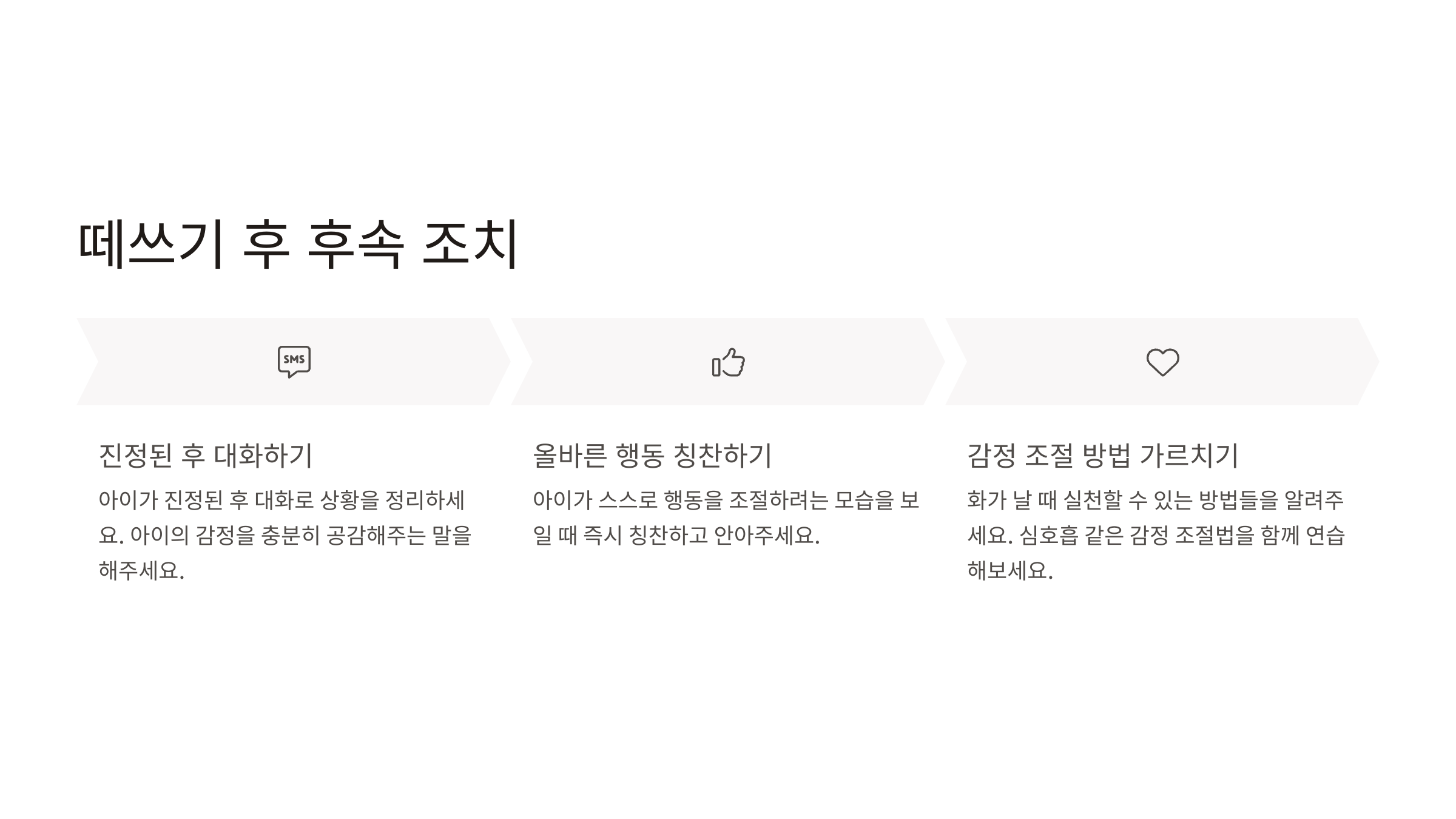 아이가 진정된 후에는 대화를 통해 상황을 정리하는 것이 중요합니다. "아까 OO을 혼자 하고 싶었구나. 그래서 기분이 안 좋았니?"와 같이 아이의 감정을 충분히 공감해주는 말을 해주세요.
