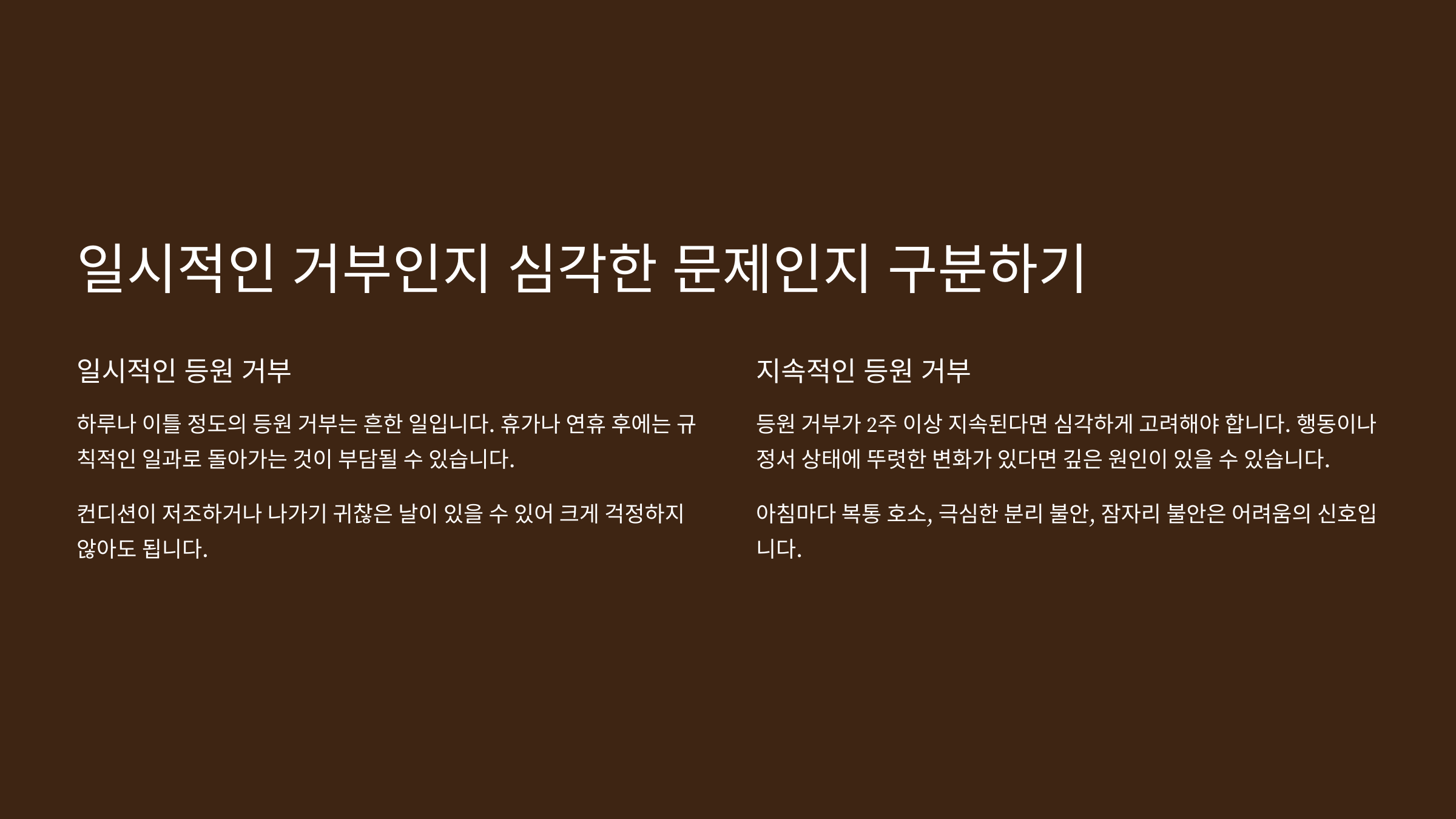 하루나 이틀 정도의 등원 거부는 흔히 일어나는 일입니다. 특히 휴가나 연휴 후에는 편안하고 자유로운 생활에서 다시 규칙적인 일과로 돌아가는 것이 아이에게 부담이 될 수 있어요. 또한 컨디션이 저조하거나, 단순히 나가기 귀찮은 날이 있을 수 있는데, 이런 일시적인 등원 거부는 크게 걱정하지 않아도 됩니다.