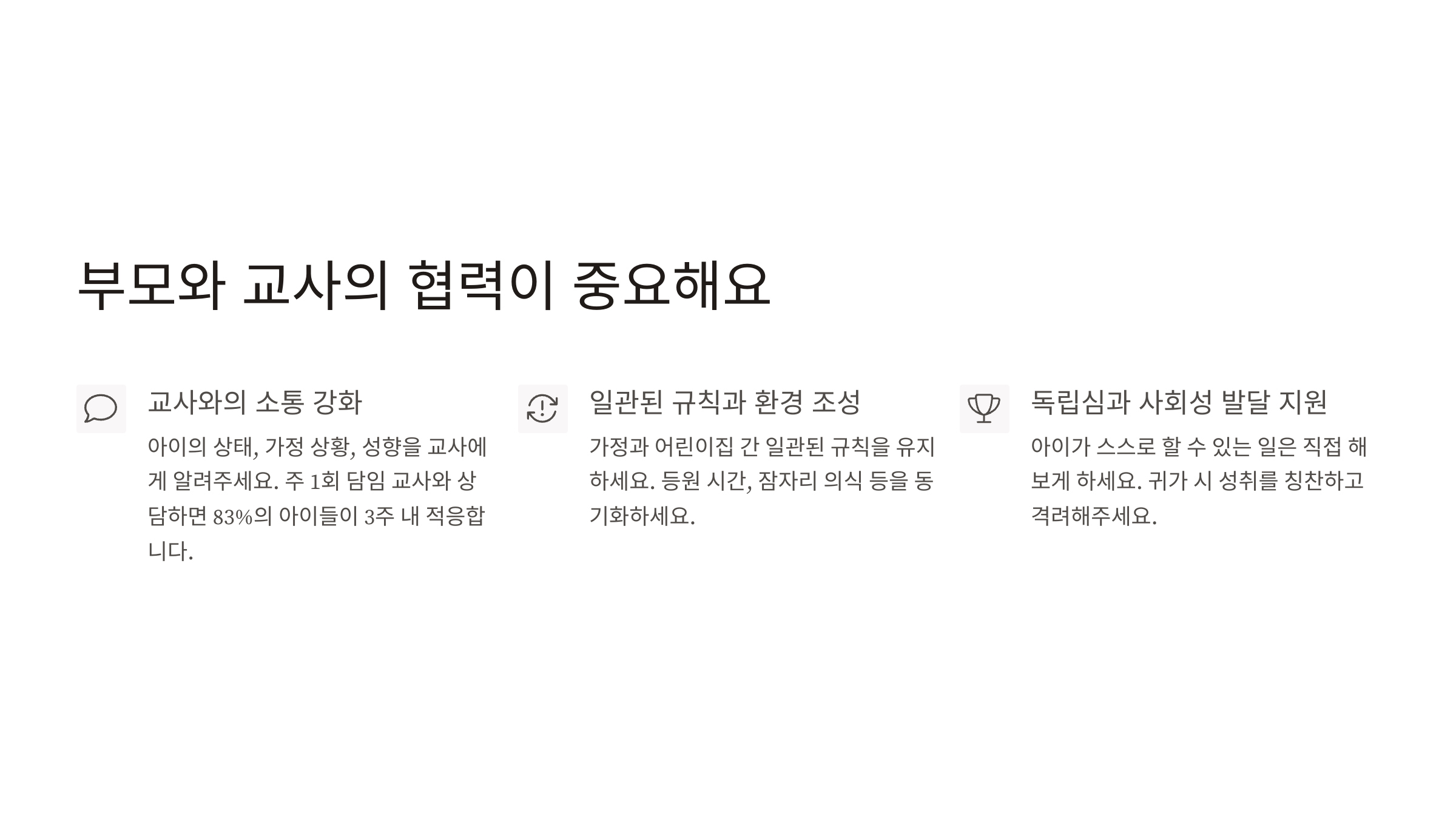 주 1회 담임 교사와 10분간 전화 상담을 진행한 사례에서 83%의 아이들이 3주 내에 적응했다는 연구 결과가 있습니다. 이는 교사와 부모의 협력이 얼마나 중요한지를 보여주는 좋은 예입니다.