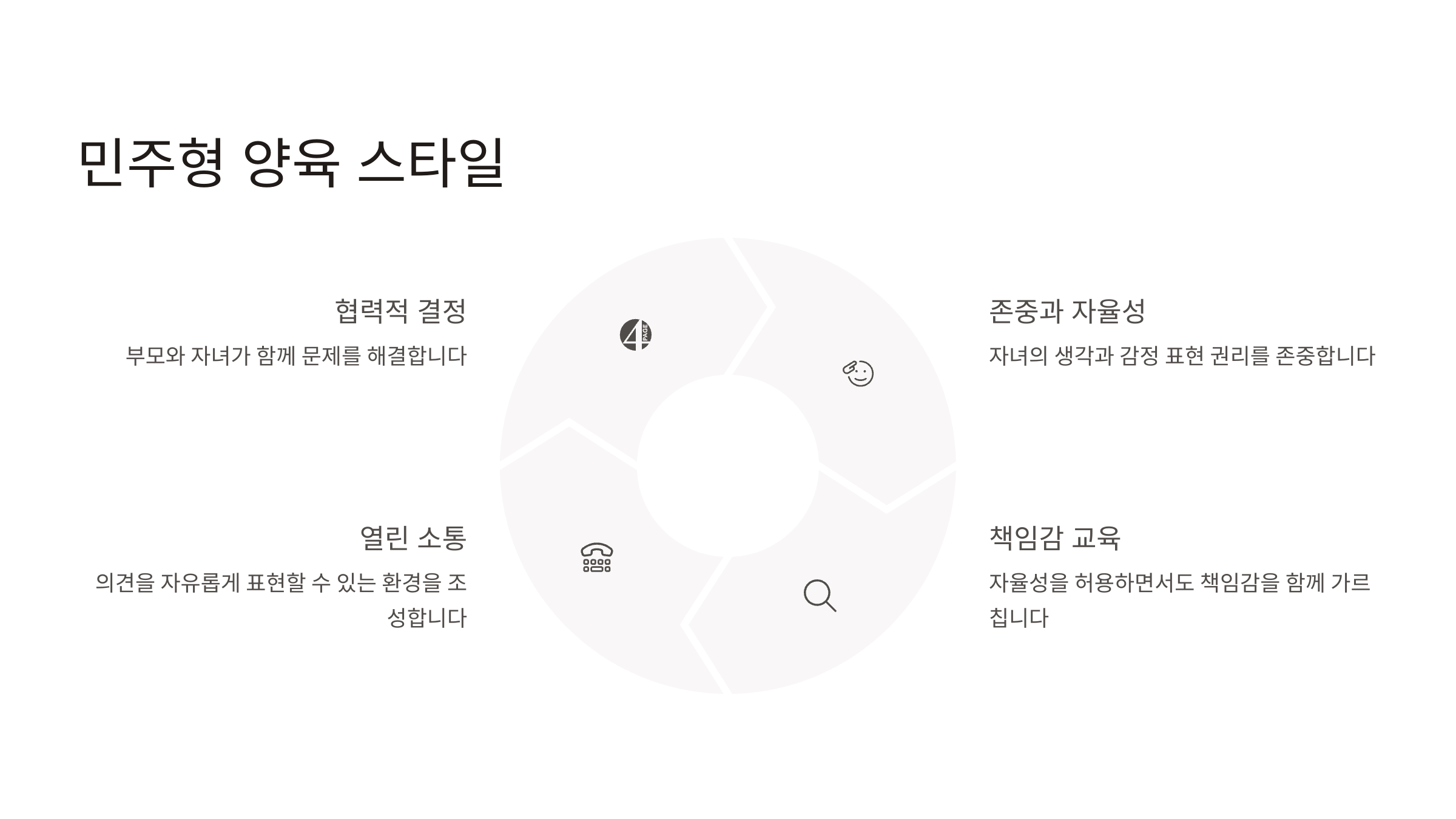 민주형 부모는 아이의 생각과 느낌을 표현하게 함으로써 자존감을 향상시키고, 의사결정에 참여할 기회를 줌으로써 발달에 긍정적인 영향을 미칩니다.