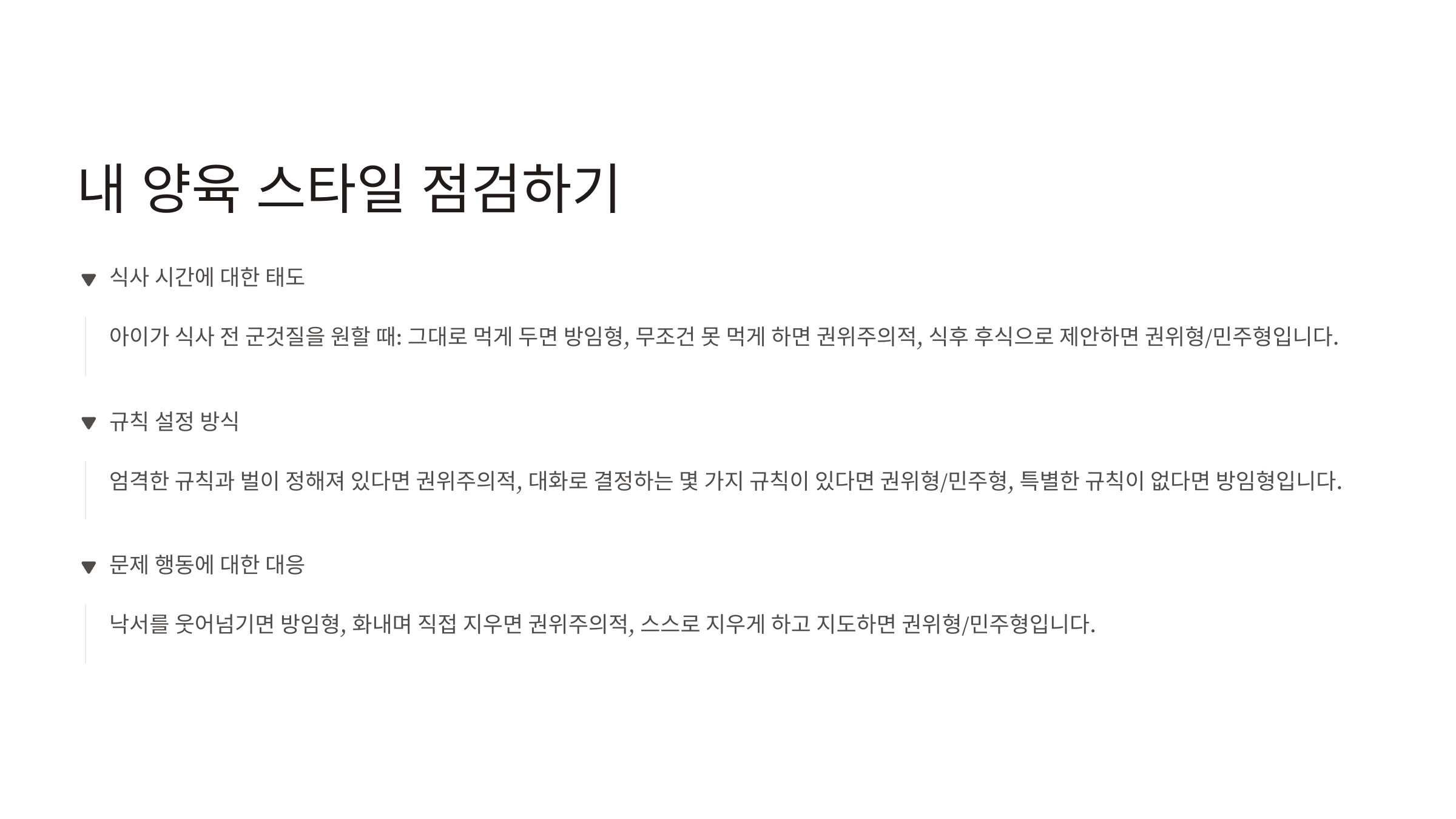 - 아이의 건강과 안전을 위한 몇 가지 규칙이 있고, 상황에 따라 대화로 결정한다 (권위형/민주형)