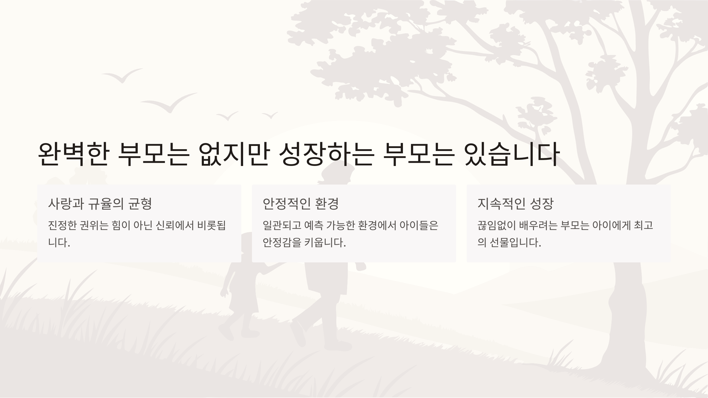 완벽한 부모는 없어요. 하지만 끊임없이 성장하고 배우려는 부모는 아이에게 최고의 선물이 될 수 있답니다. 신뢰와 존중의 관계를 통해 아이의 행복하고 건강한 성장을 돕는 진정한 권위를 발휘하는 부모가 되기 위해 함께 노력해 나가요!