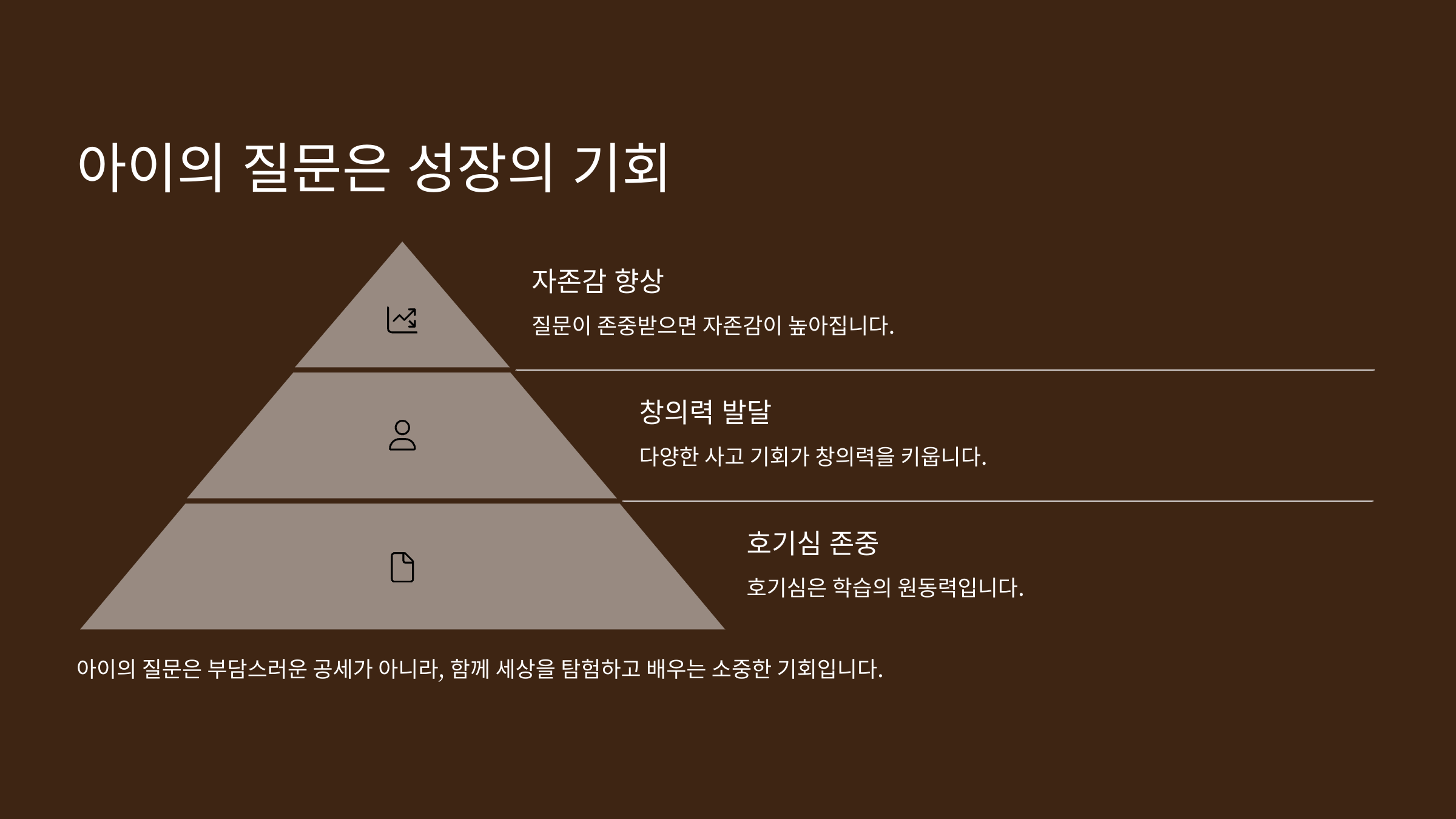 아이의 질문은 곧 아이의 호기심이 폭발하는 것입니다. 이러한 호기심을 존중하고 적절히 대응함으로써 사고력과 학습능력, 자존감이 높은 아이로 성장하도록 도울 수 있어요. 아이의 질문은 부담스러운 공세가 아니라, 함께 세상을 탐험하고 배우는 소중한 기회임을 기억하세요.