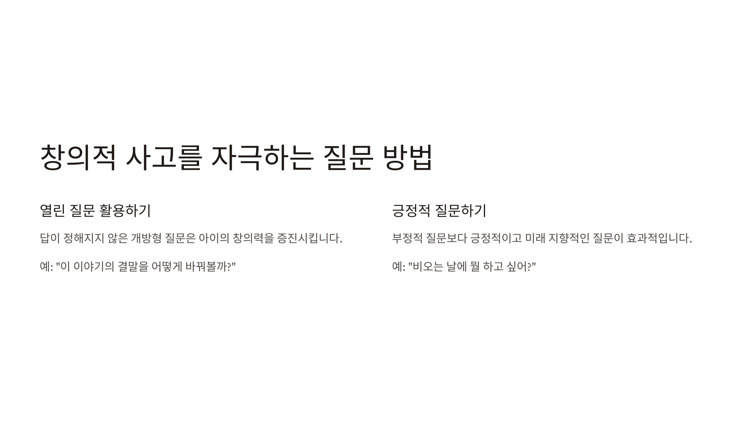아이의 창의적 사고를 자극하기 위해서는 '열린 질문'을 활용하는 것이 좋아요. 열린 질문은 아이들이 스스로 생각을 할 수 있도록 답이 정해지지 않은 개방형 질문입니다. 이는 아이의 창의력을 증진하고, 더욱 풍부한 대화를 나눌 수 있게 해줘요.