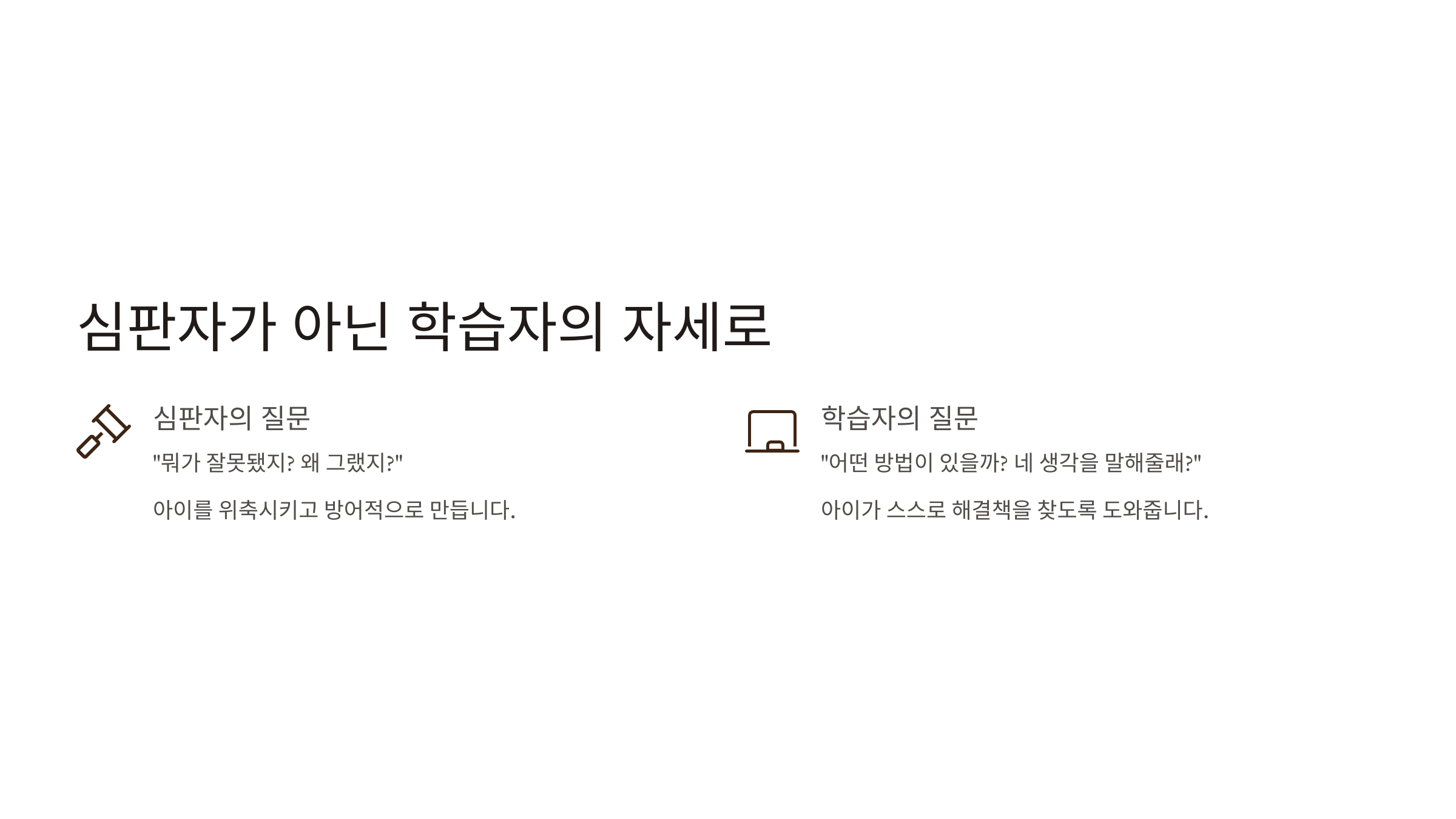 부모-자녀 소통에서 중요한 것은 '심판자'가 아닌 '학습자'의 자세로 질문하는 것이에요. 심판자의 질문("뭐가 잘못됐지? 왜 그랬지?")은 아이를 위축시키고 방어적으로 만들 수 있어요. 반면 학습자의 질문("제대로 하려면 어떤 방법이 있을까? 네가 그렇게 한 까닭이 무엇인지 말해 줄 수 있겠니?")은 아이가 자신의 생각을 표현하고 스스로 해결책을 찾도록 도와줍니다.