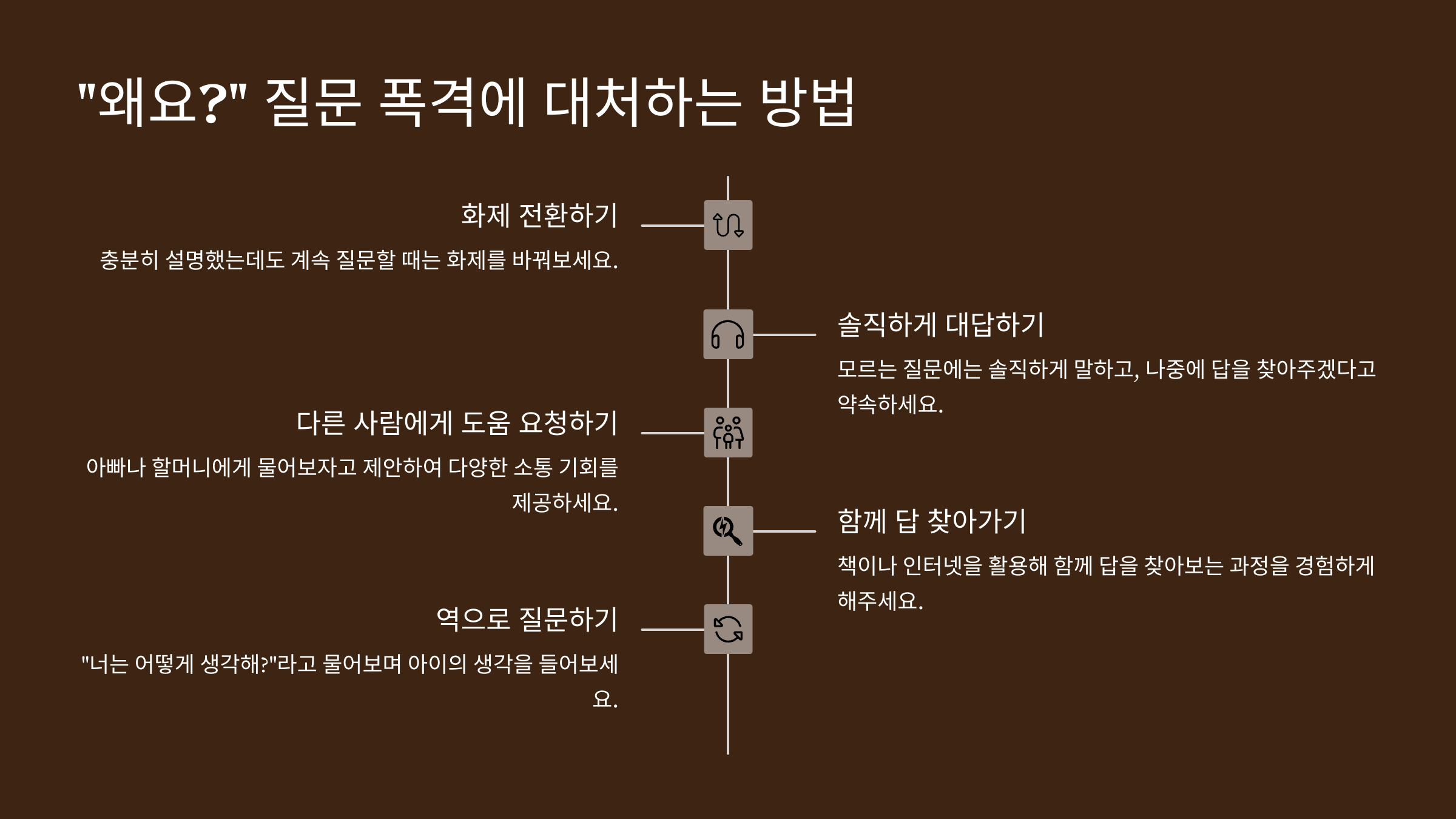 - 역으로 질문하기: "너는 어떻게 생각해?"라고 물어보며 아이의 생각을 들어보는 것도 좋은 방법입니다.