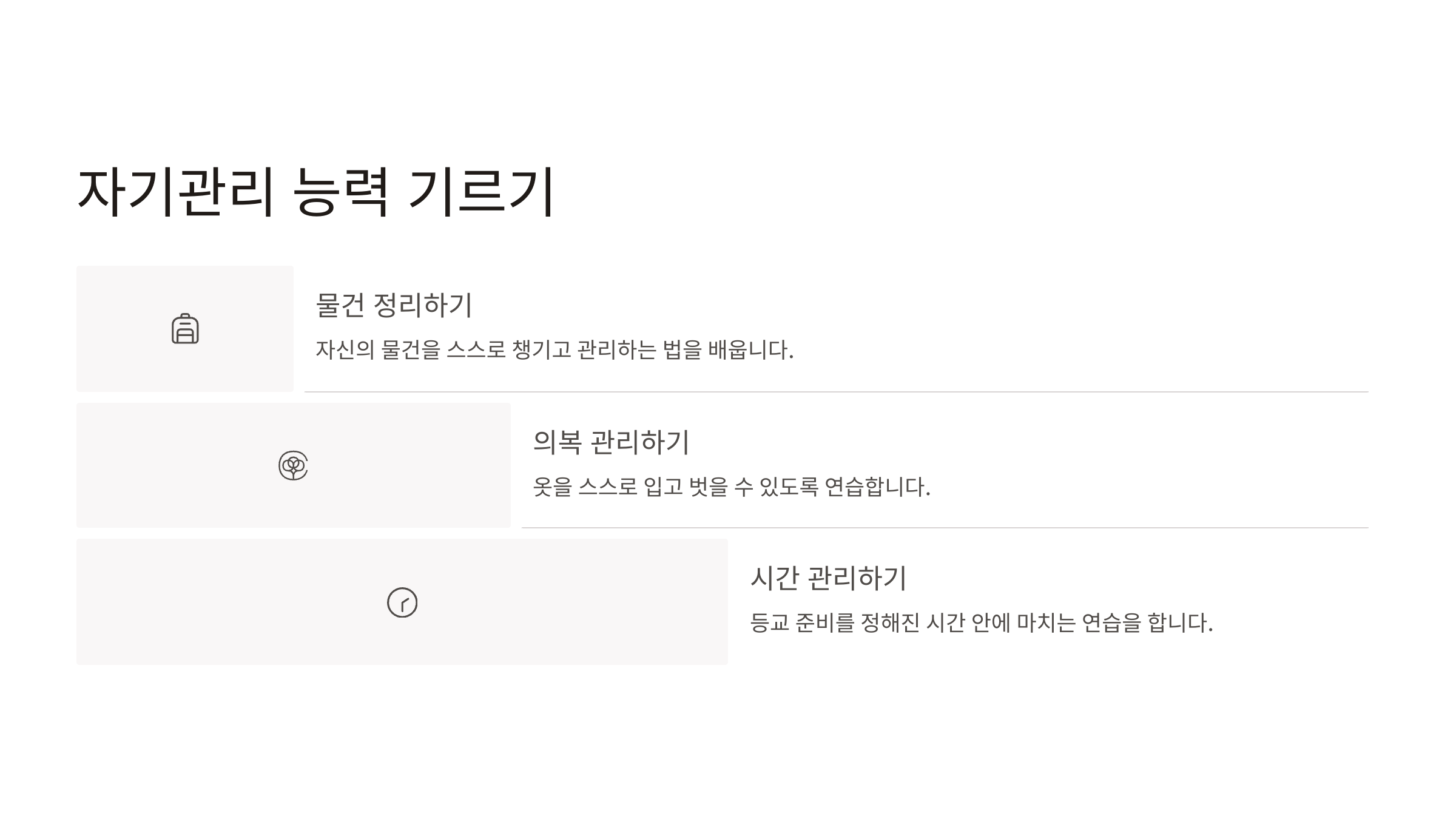 - 화장실 사용 후 물 내리기, 옷 바르게 정돈하기 등 연습