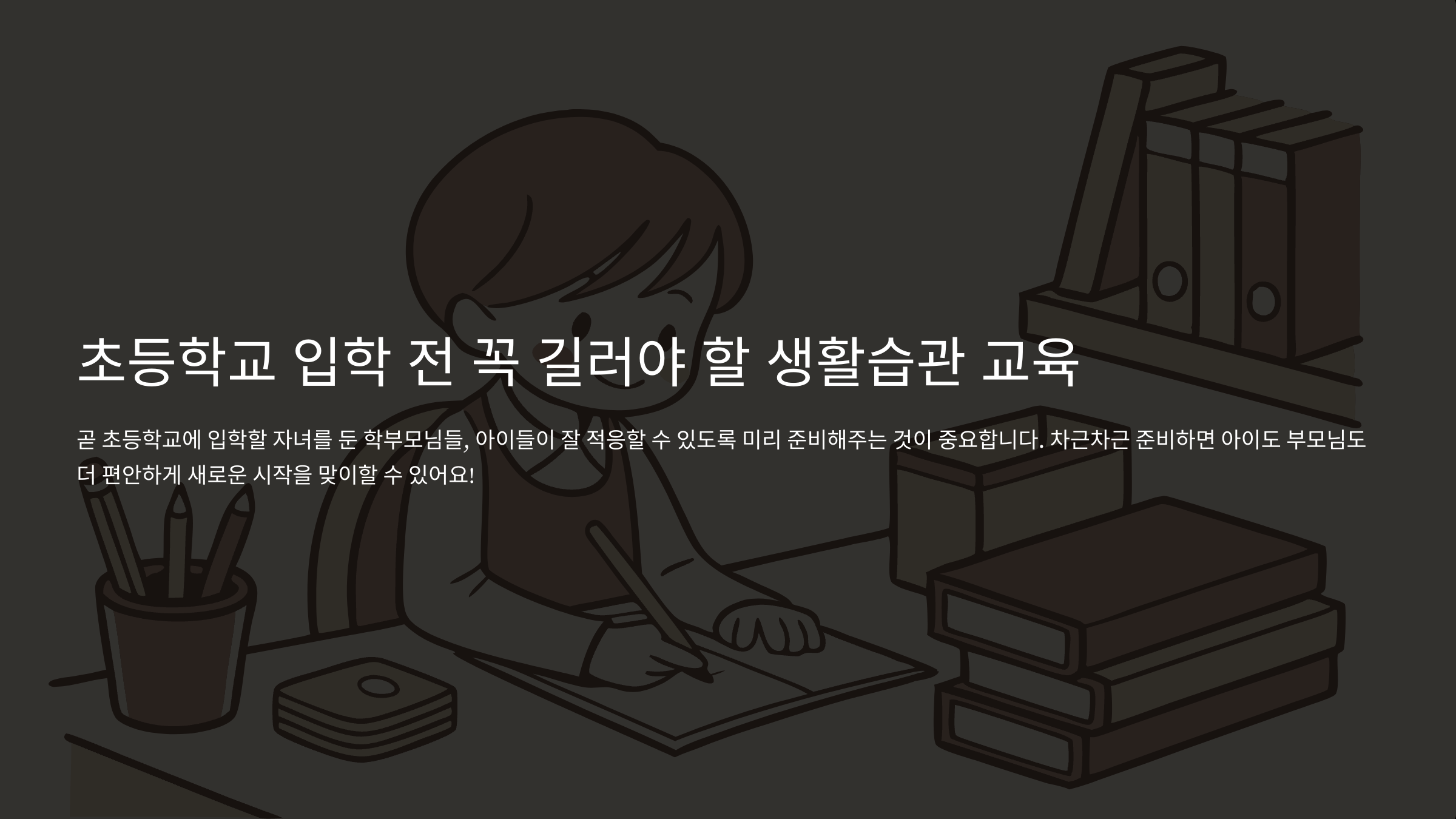 안녕하세요! 곧 초등학교에 입학할 자녀를 둔 학부모님들, 많이 설레기도 하고 걱정도 되시죠? 유치원이나 어린이집과는 다른 환경에서 아이들이 잘 적응할 수 있도록 미리 준비해주는 것이 중요한데요. 오늘은 초등학교 입학 전 꼭 길러야 할 생활습관에 대해 알아보겠습니다. 차근차근 준비하면 아이도 부모님도 더 편안하게 새로운 시작을 맞이할 수 있을 거예요!