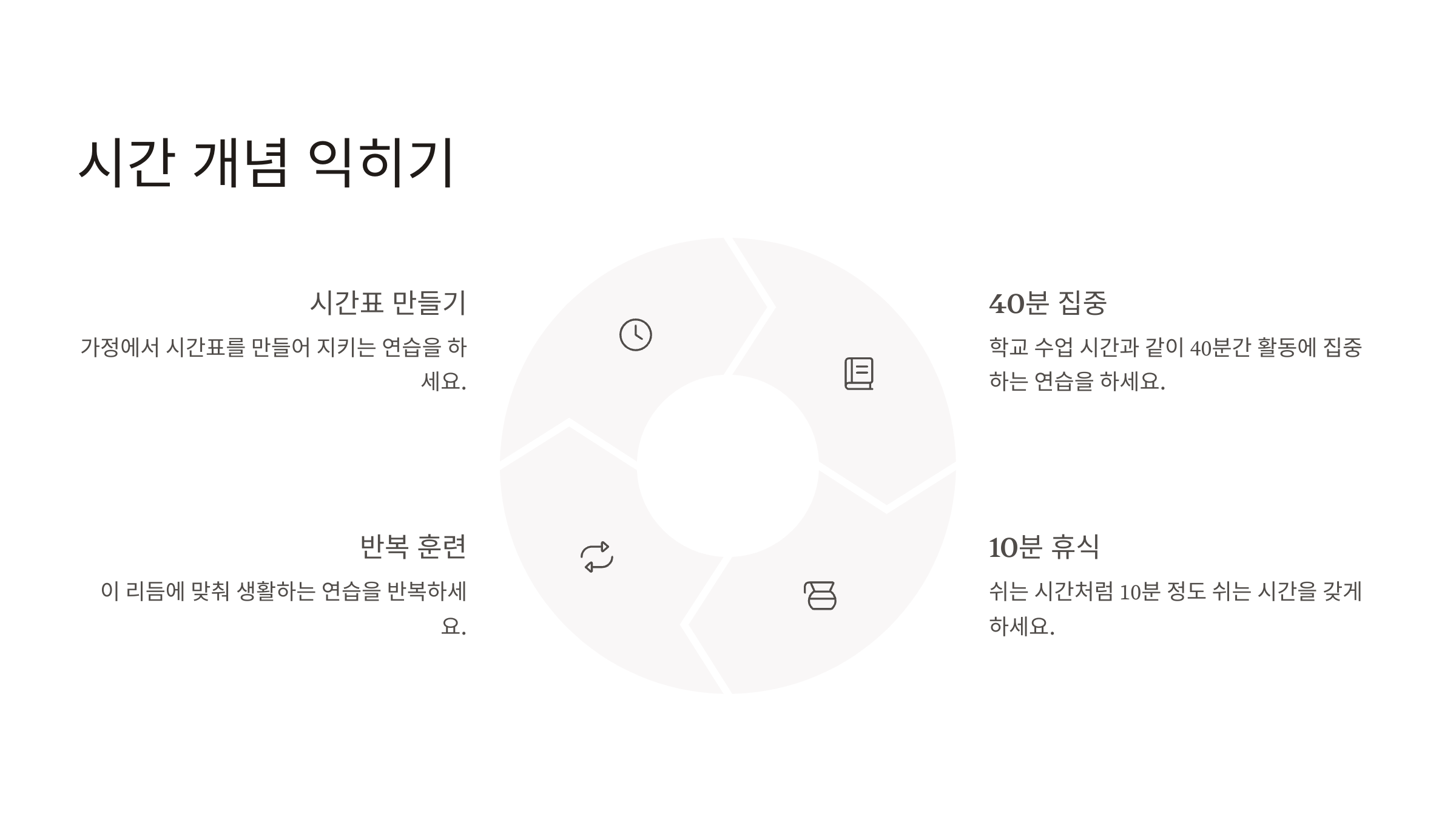 "아이가 좋아하는 활동이 있다면 40분간 활동에 집중하고 10분 정도 쉴 수 있도록 해 주세요." 이렇게 학교 수업 시간(40분)과 쉬는 시간(10분)의 리듬에 맞춰 생활하는 연습을 하면 도움이 됩니다.