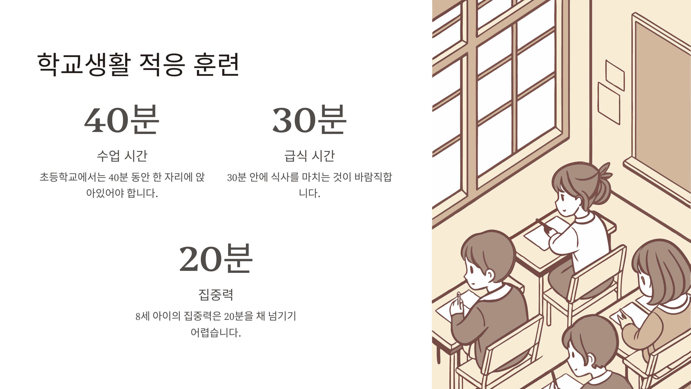 초등학교에서는 40분 동안 수업을 받는 동안 한 자리에 앉아있어야 합니다. 8세 아이의 집중력은 20분을 채 넘기기 어려우므로 앉아있는 연습이 필요합니다.