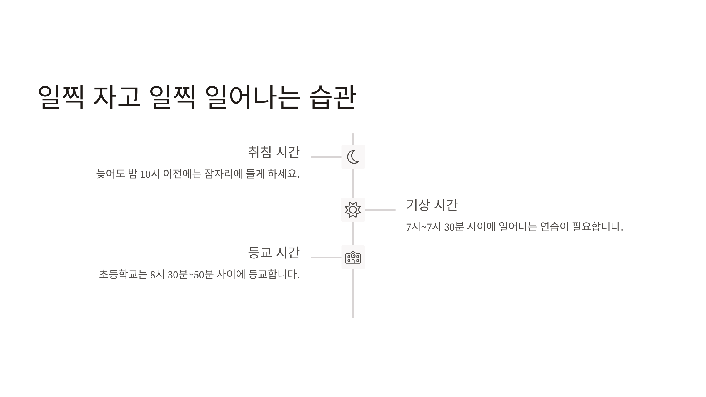 입학 몇 주 전부터는 실제 등교 시간에 맞춰 기상하는 습관을 들이고, 늦어도 밤 10시 이전에는 잠자리에 들게 하며 낮잠 자는 습관도 점차 줄이는 것이 좋습니다. 아이가 충분한 수면을 취하지 못하면 학교생활 적응이 어려울 수 있으므로 규칙적인 수면 패턴은 매우 중요해요.
