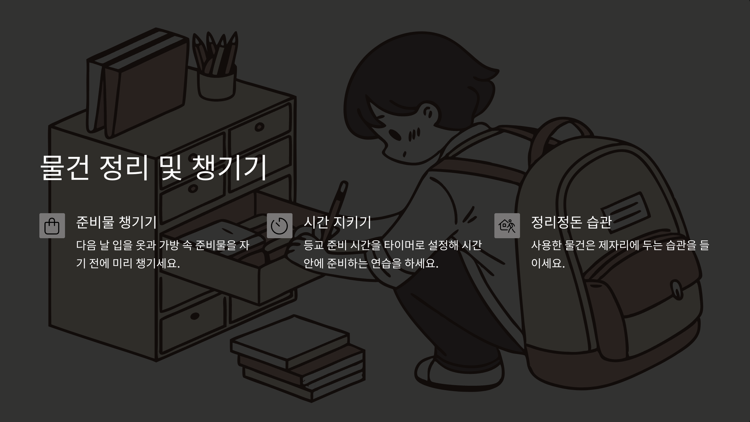 - 다음 날 입을 옷과 가방 속 준비물을 자기 전에 미리 챙기기