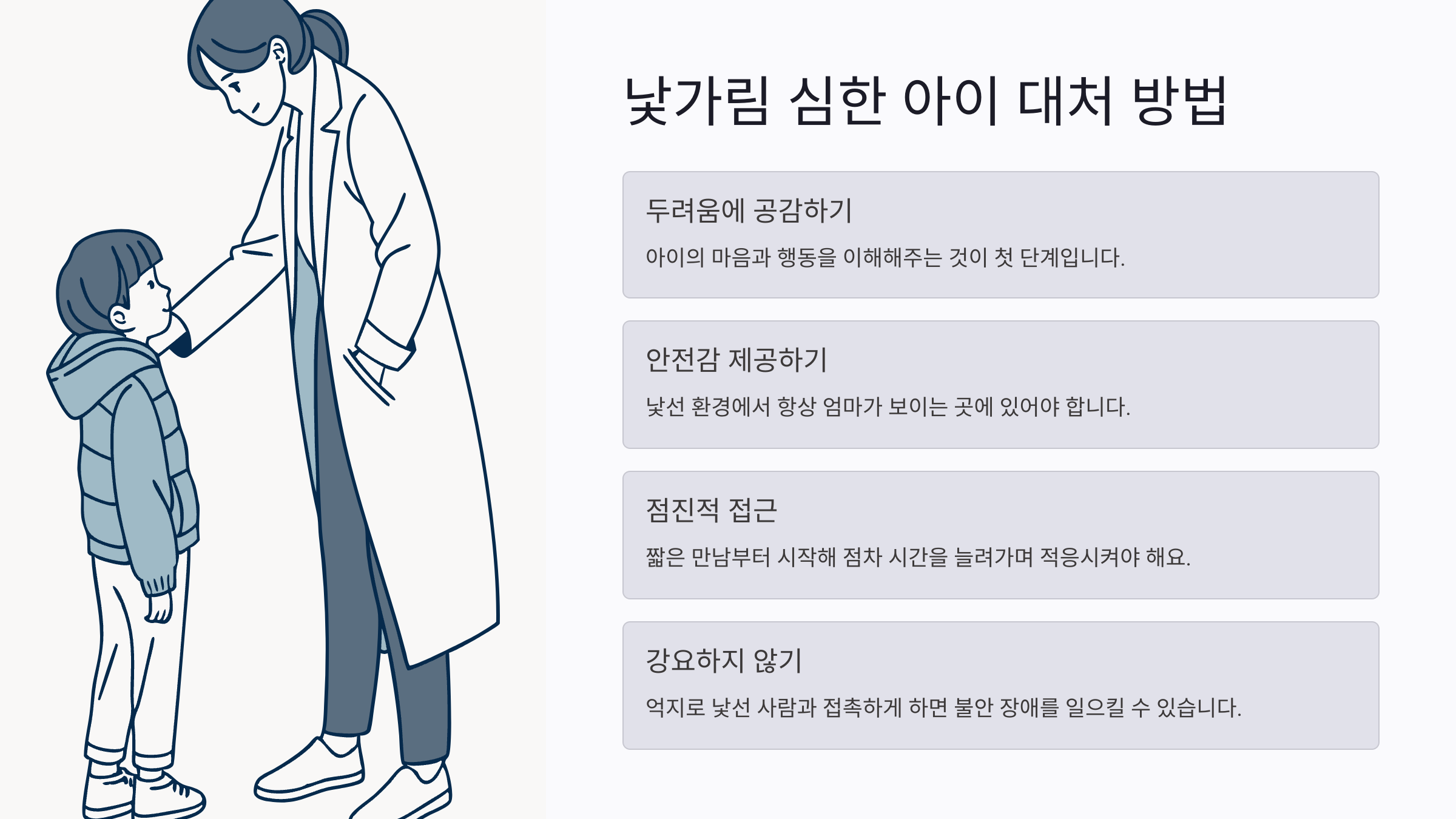 낯가림을 완화시키는 가장 좋은 방법은 아이가 스스로 안전하다고 믿을 수 있게 조금씩 적응시키는 것입니다. 그 첫 번째 단계는 아이의 두려움에 공감해 주는 것이에요. 이제 막 세상을 알아가는 아이에게 모든 것이 무섭고 두렵게 느껴지는 것은 당연합니다. 엄마가 먼저 아이의 편이 되어 무서워하는 아이의 마음과 울고 떼쓰는 행동을 이해해 주어야 해요.