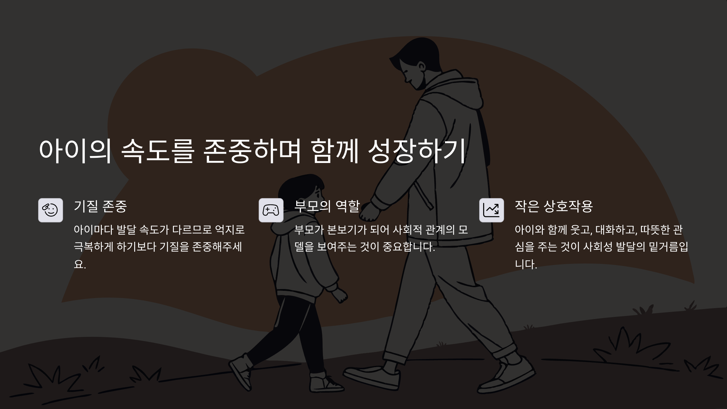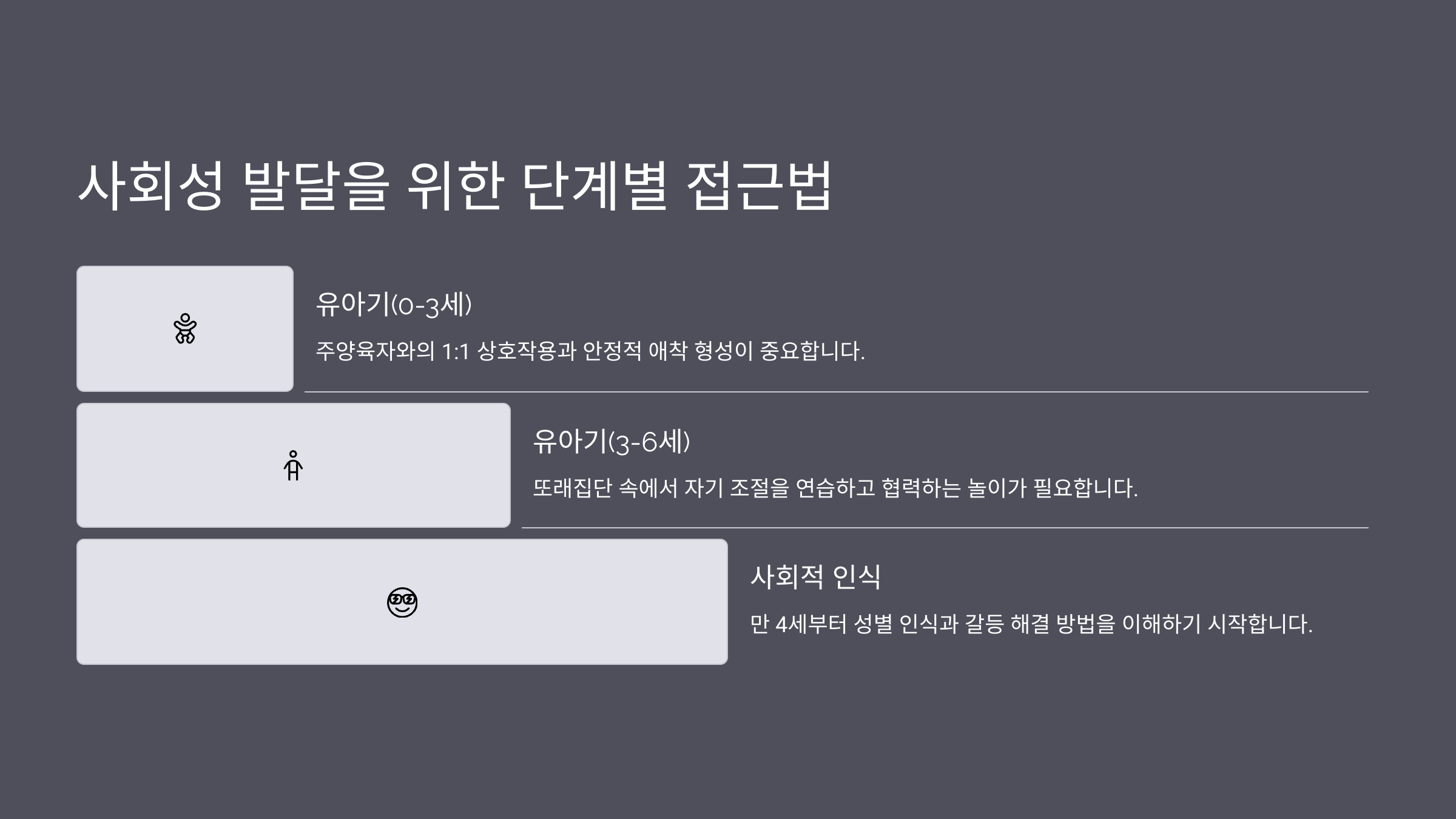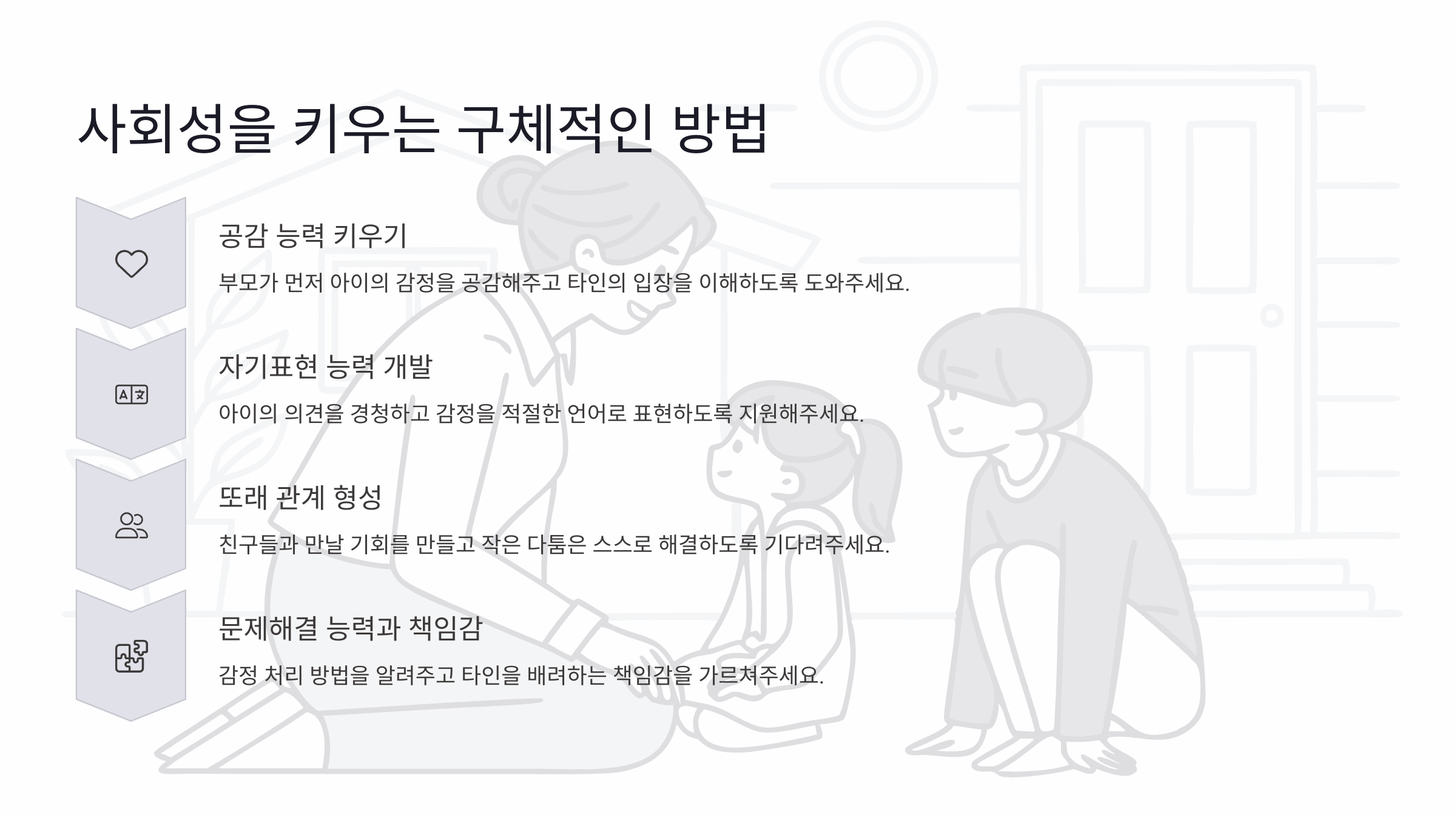 아이의 사회성 발달을 위해서는 안정적인 애착 형성, 공감 능력 키우기, 자기표현 능력 개발, 또래 관계 형성 지원, 문제해결 능력과 책임감 키우기 등의 다양한 접근이 필요해요. 무엇보다 부모가 본보기가 되어 아이에게 사회적 관계의 모델을 보여주는 것이 중요합니다.