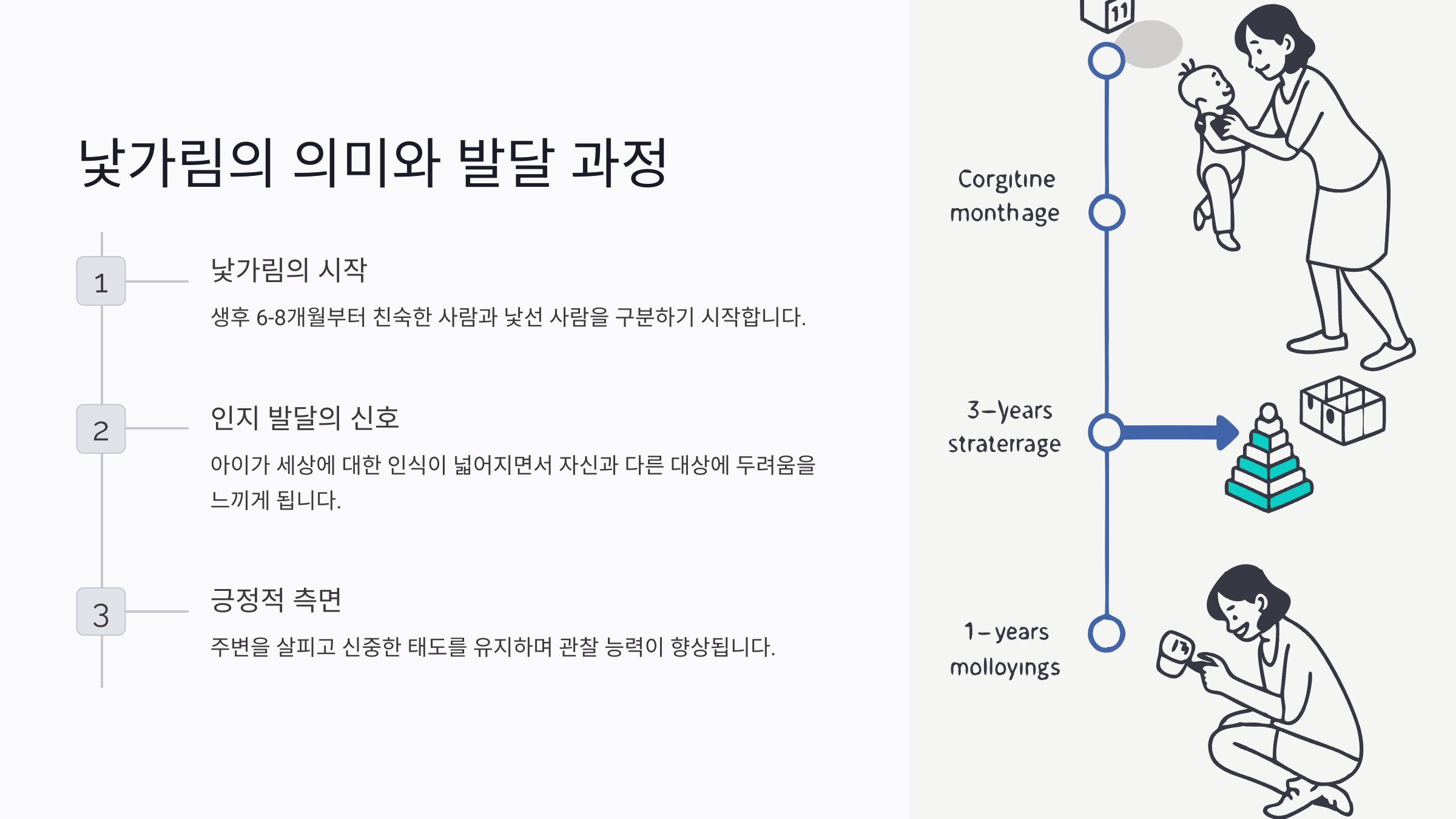 낯가림은 아이가 친숙한 사람과 낯선 사람을 구분할 수 있게 되었다는 인지 발달의 긍정적인 신호입니다. 대부분의 아이들은 생후 6-8개월 무렵부터 낯가림을 시작해요. 이전에는 모든 사람을 구분 없이 반응했던 아이가 낯가림을 통해 자신에게 중요한 애착 대상과 그렇지 않은 사람을 구분하기 시작한다는 의미죠.