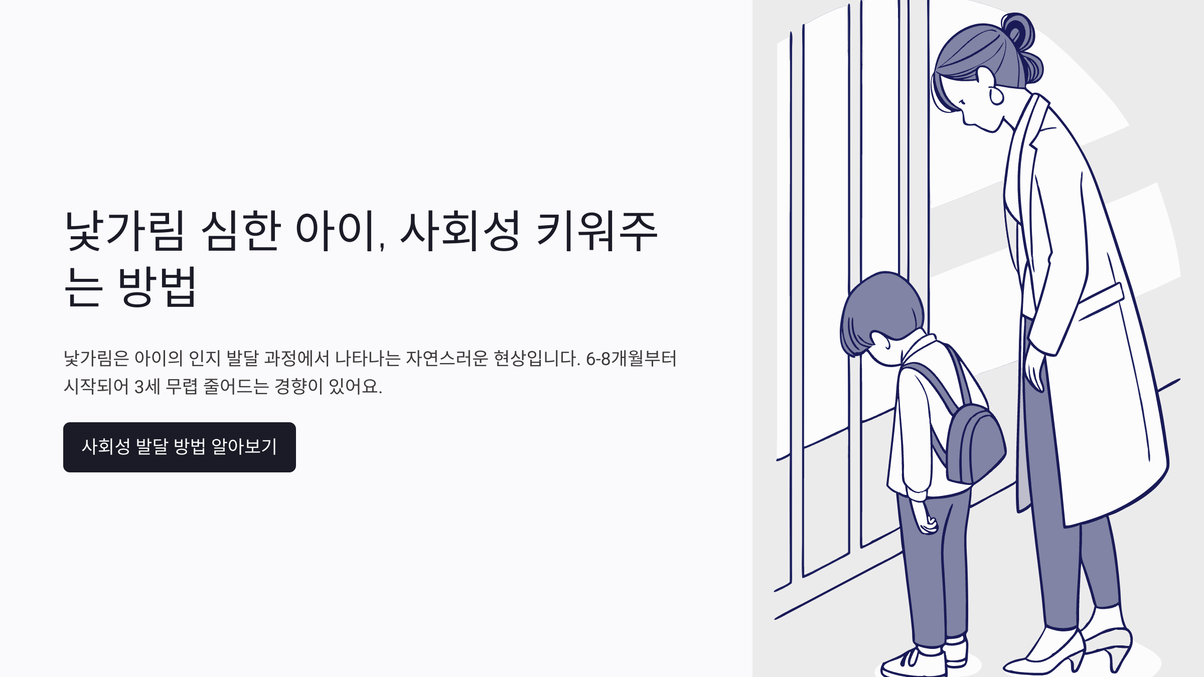 아이가 낯선 사람을 만나면 엄마 뒤로 숨거나 울음을 터뜨리나요? 낯가림은 아이의 인지 발달 과정에서 나타나는 자연스러운 현상인데요. 약 6-8개월부터 시작되어 3세 무렵 점차 줄어드는 경향이 있습니다. 다만 이 현상이 지속되거나 심화될 경우 사회성 발달에 영향을 미칠 수 있어요. 오늘은 낯가림의 본질을 이해하고, 아이가 자신감을 가지고 사회적 관계를 형성할 수 있도록 돕는 구체적인 방법을 알아보겠습니다.