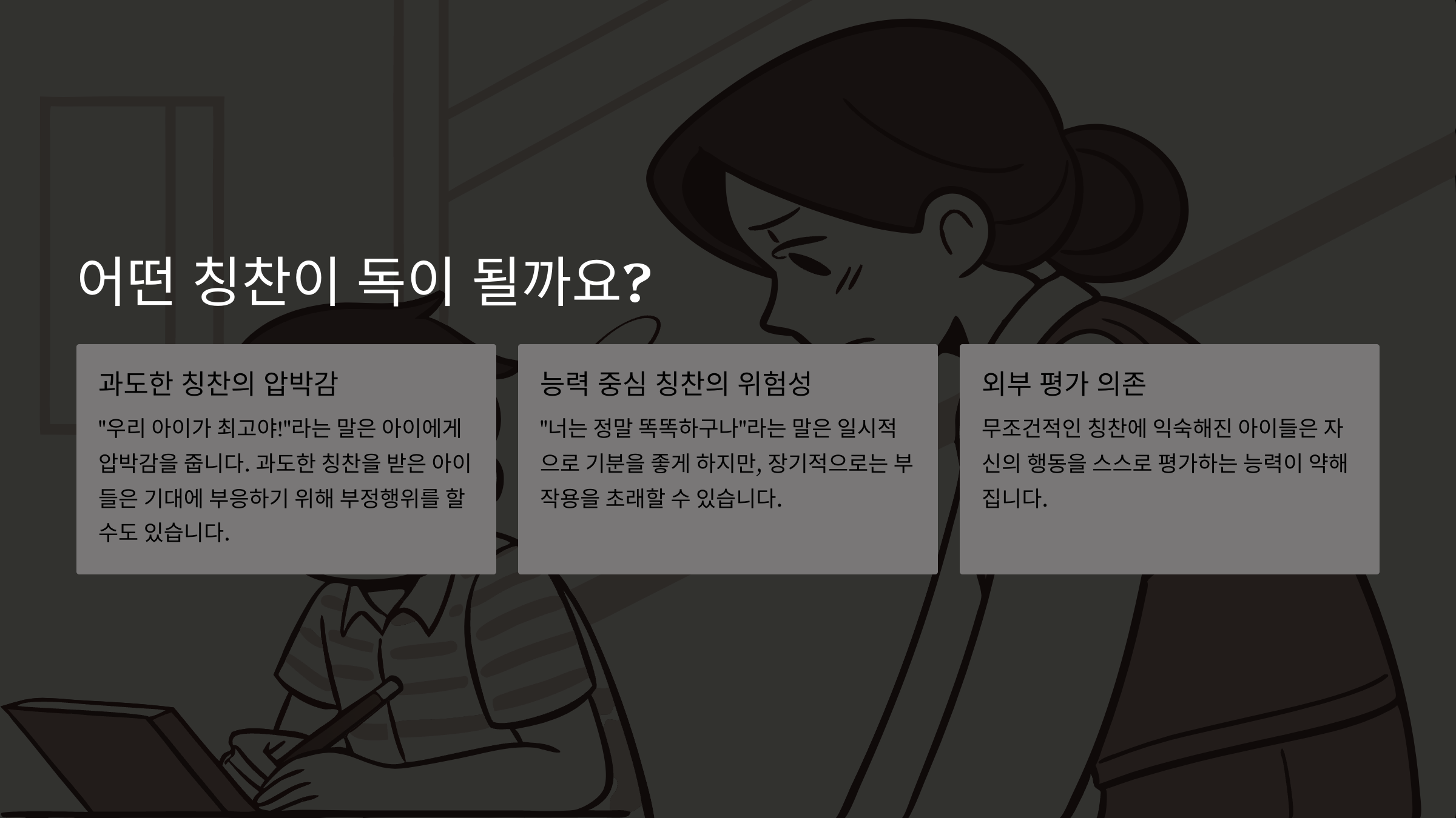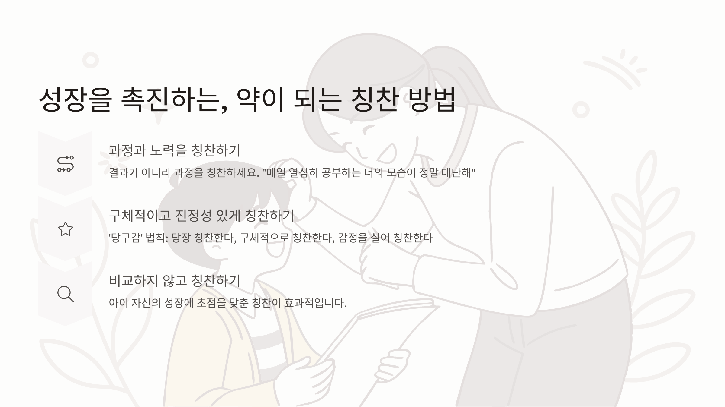 우리의 칭찬이 아이들에게 미치는 영향력은 생각보다 훨씬 크답니다. 오늘부터 칭찬의 방식을 조금만 바꿔보는 건 어떨까요? 작은 변화가 아이의 평생을 바꿀 수 있습니다!