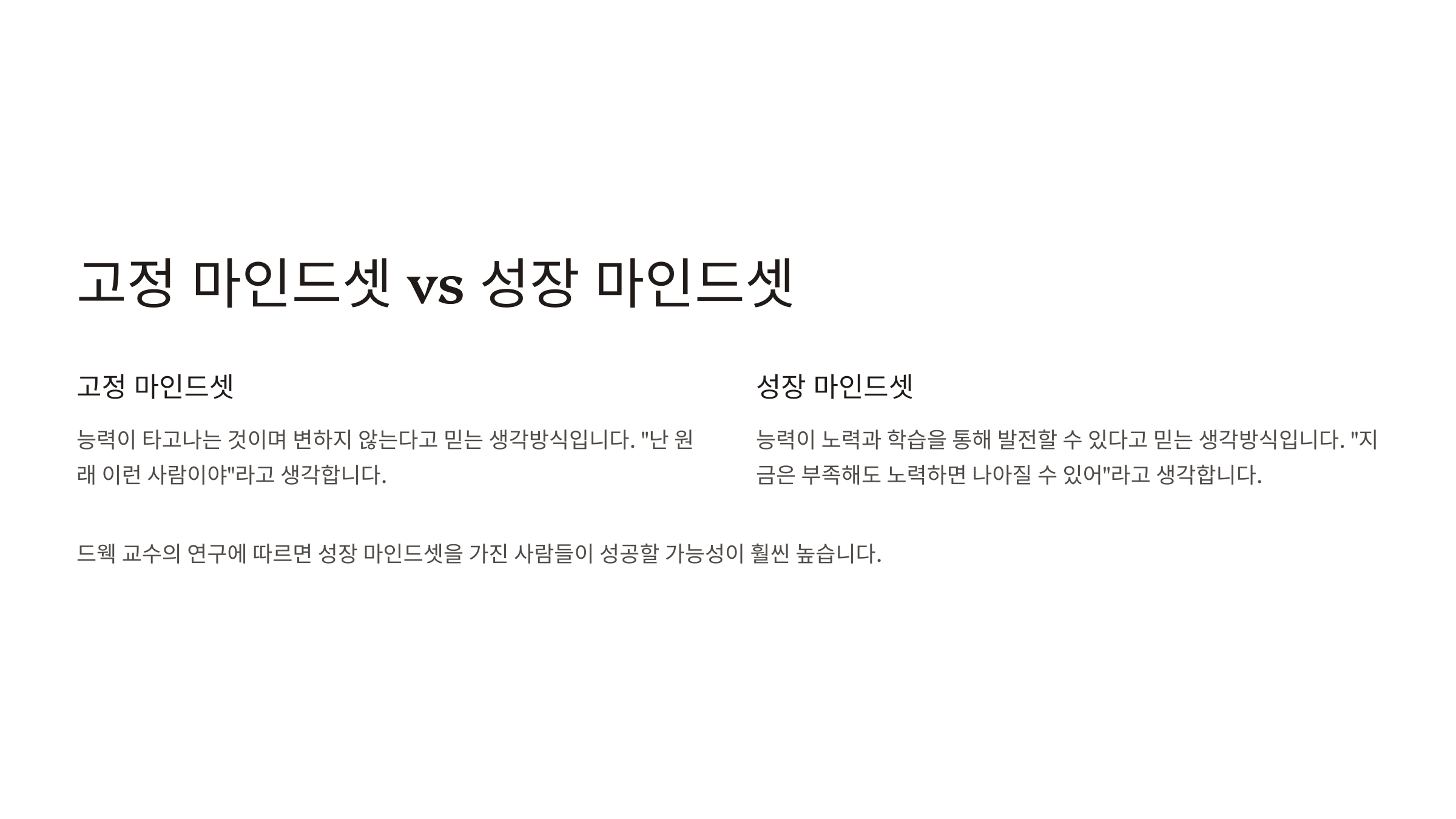 드웩 교수의 연구에 따르면 "능력은 변하지 않는다고 믿는 고정 마인드셋을 가진 사람들에 비해 능력은 얼마든지 발전시킬 수 있다고 생각하는 성장 마인드셋을 가진 사람들이 성공할 가능성이 훨씬 높다"고 합니다.