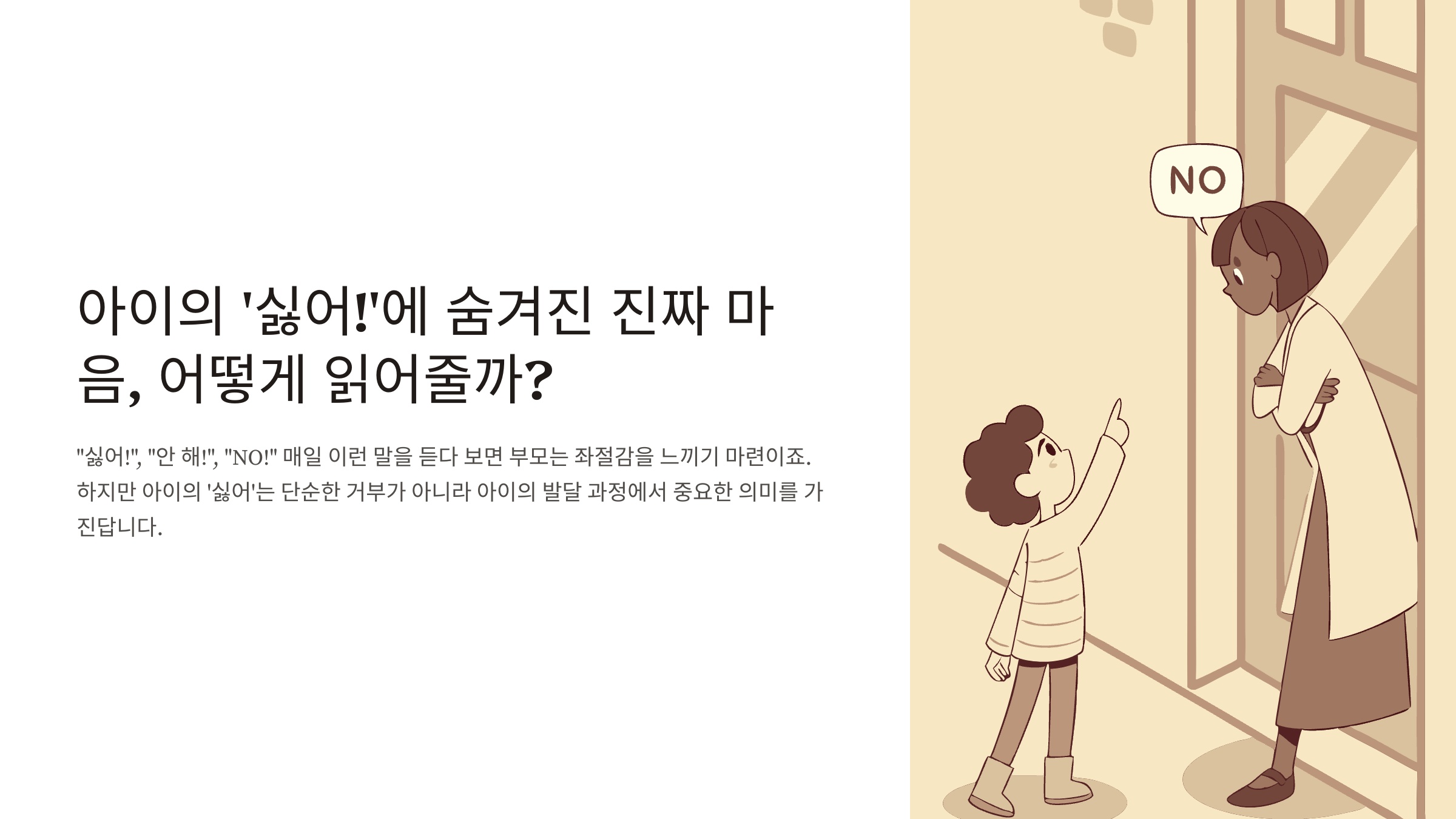 아이의 '싫어'를 들을 때마다 좌절하기보다는, 그 속에 담긴 성장의 신호를 발견하고 아이의 마음을 읽어주는 부모가 되어보세요. 그렇게 하면 아이는 점점 더 다양한 방식으로 자신의 감정을 표현할 수 있게 될 거예요!