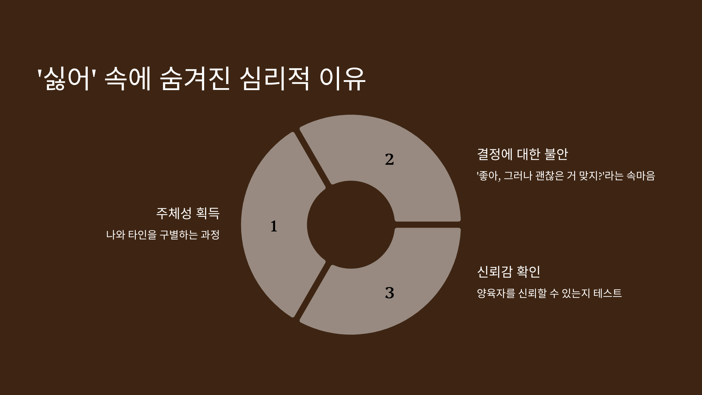 2-3세 아이들은 심리학자 에릭슨이 말한 '자율성 대 수치심' 단계에 있어요. 이 시기에 아이들은 자신의 의지와 통제력을 발달시키며 스스로 행동하려는 욕구가 강해집니다. 즉, "아이가 '싫어'라는 말을 하기 시작했다면 엄마에게 의존하던 상황을 벗어나 스스로 무엇인가를 할 수 있게 된 시기"라는 뜻이에요.