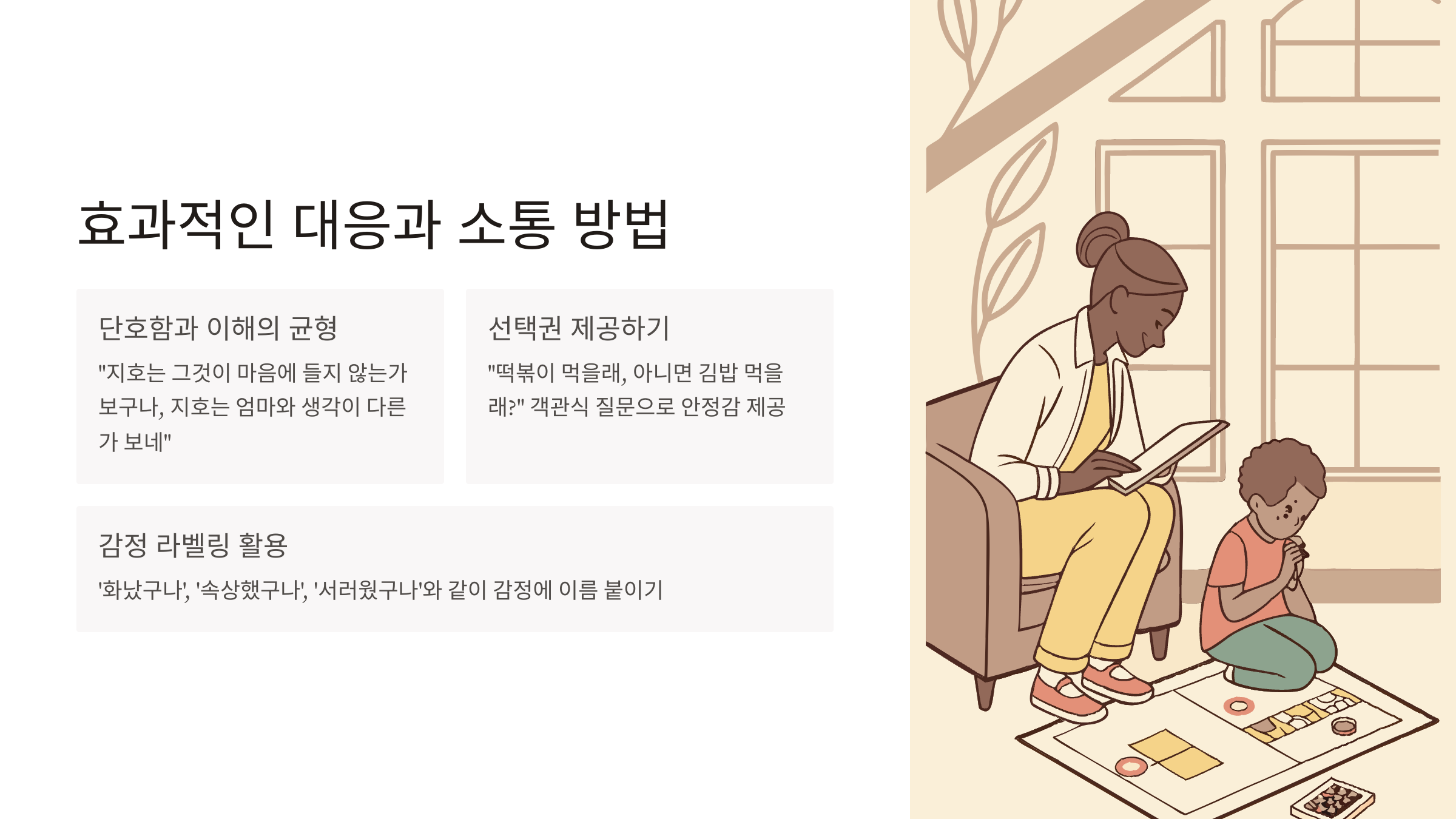 신경과학 연구에 따르면, 감정 라벨링은 특히 부정적인 감정에 더욱 효과적이랍니다. 아이가 울 때 "울지 마, 뚝 그쳐!"라고 다그치는 것보다 "많이 속상했구나. 서러웠구나"라고 아이의 마음을 읽어주면 아이의 감정이 자연스럽게 정화되는 것을 도울 수 있어요.