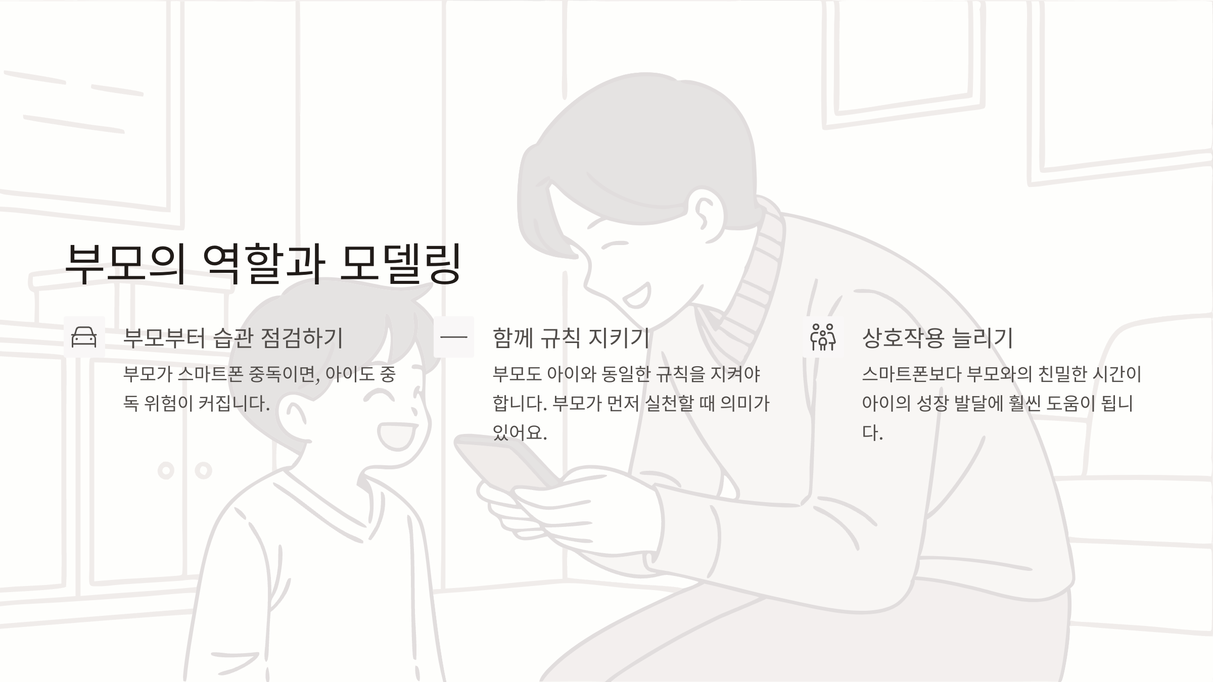 - 감정적으로 기기에 의존하고 있는지, 아니면 학습과 정보 탐색 등 긍정적인 목적으로 활용하고 있는지 꾸준히 관찰하고 대화해보세요.