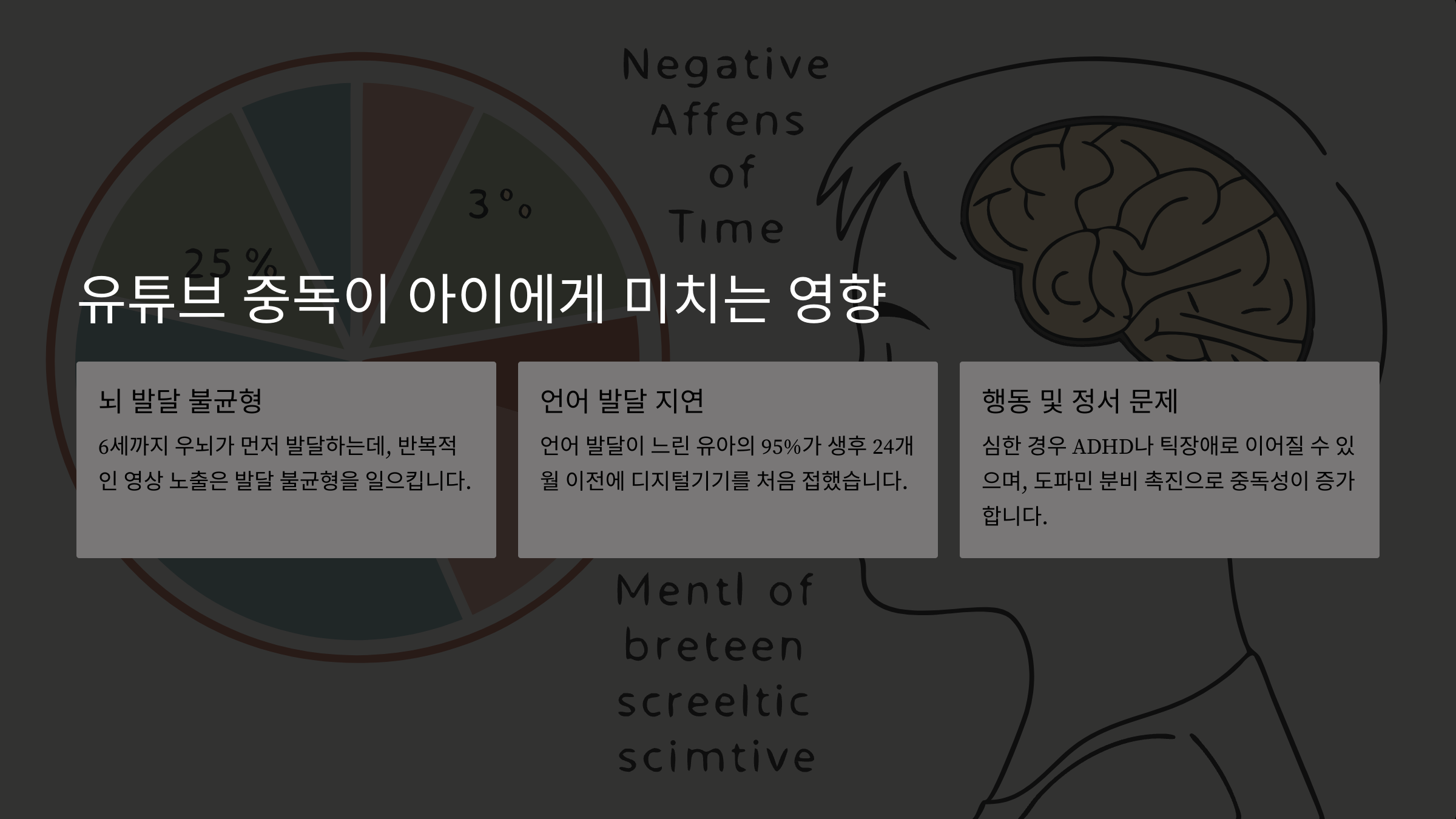 심한 경우, 유튜브 중독은 ADHD나 틱장애(눈 깜박임, 목 경련, 얼굴 찡그림 등)로 이어질 수도 있어요. 또한 유튜브의 자극적인 콘텐츠에 지속적으로 노출되면 도파민 분비가 촉진되어 중독성이 증가하고, 일상의 상대적으로 느리고 단순한 자극에 대한 감각 발달이 늦어질 수 있습니다.
