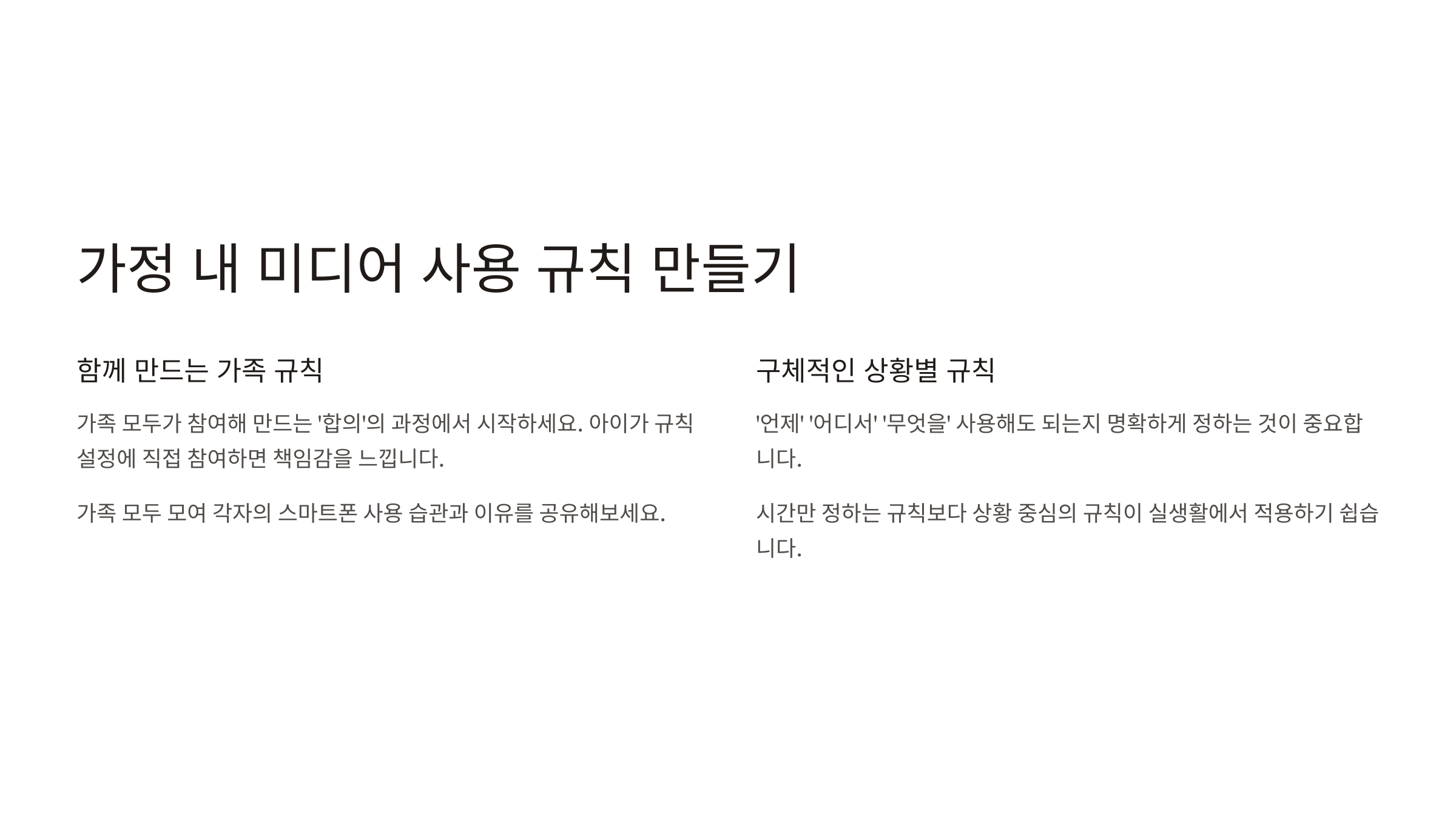 - 구체적인 사용 시간과 상황별 규칙을 명확히 정해주세요.