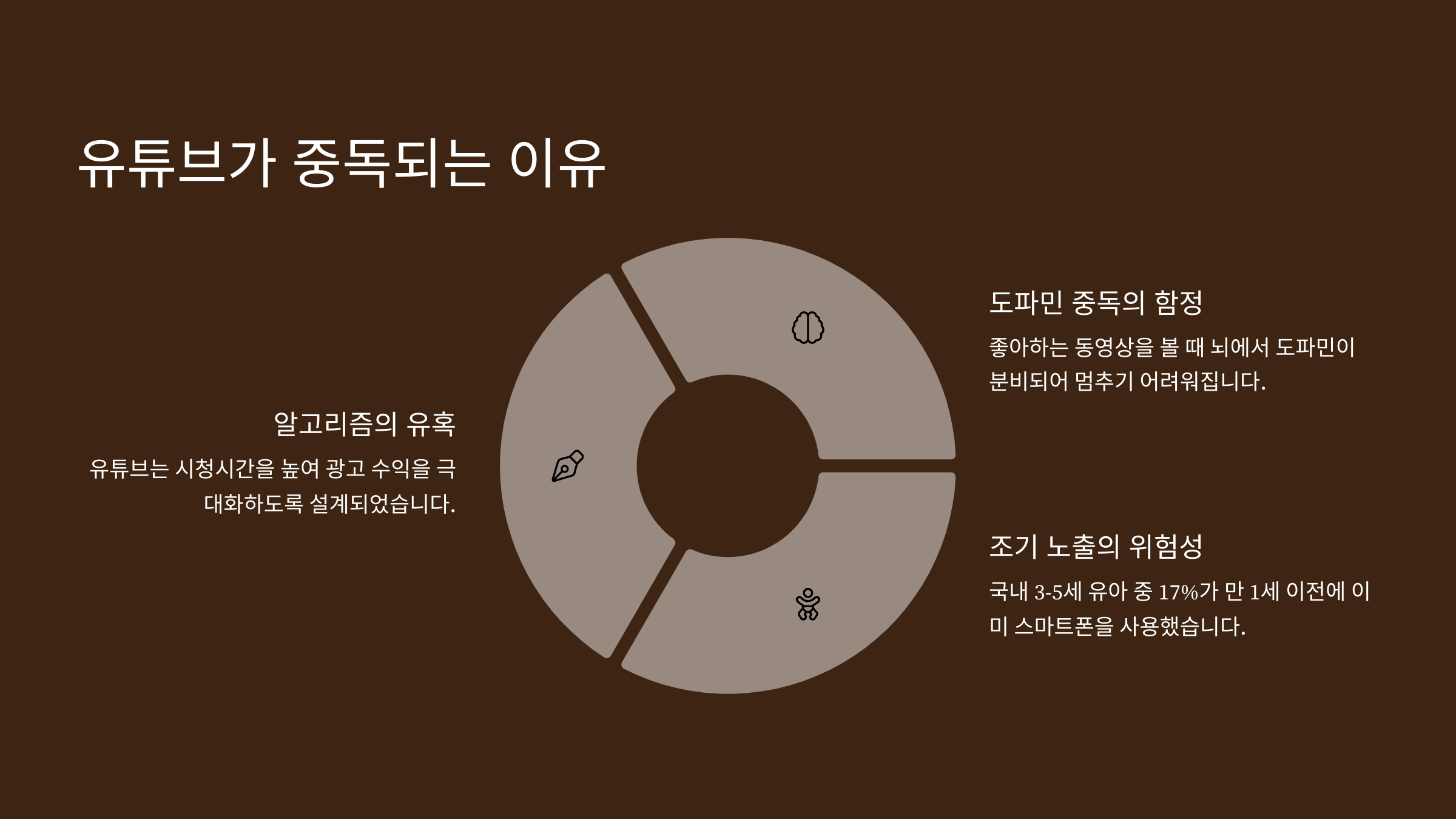 유튜브는 시청시간을 높여 광고 수익을 극대화하도록 설계되었어요. 사용자들이 더 오래 머물 수 있도록 AI 알고리즘을 통해 끊임없이 매력적인 콘텐츠를 추천합니다. 특히 자기 통제력이 부족한 아이들에게는 이런 시스템이 강한 중독성을 유발하게 돼요.