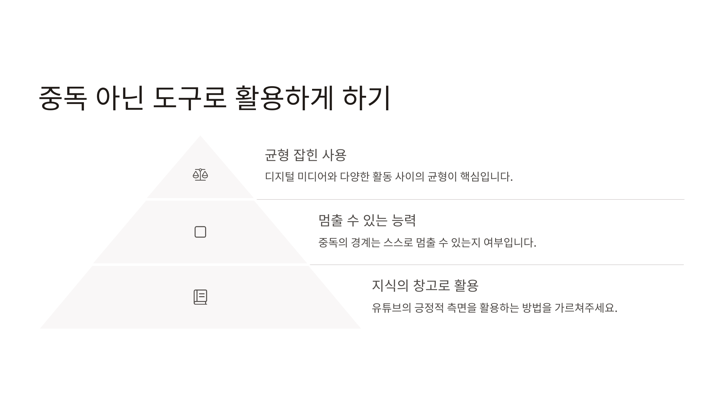 아이들이 유튜브에 중독되지 않도록 하는 가장 핵심적인 방법은 바로 '멈출 수 있는 능력'을 키워주는 것이에요. 중독의 경계는 스스로 멈출 수 있다면 중독이 아니고, 멈출 수 없다면 중독입니다. 자주 '멈추는 습관'을 통해 유튜브 중독을 예방하고, 디지털 시대에 필요한 자기 조절 능력을 기르도록 도와주는 것이 현명한 육아의 핵심입니다.