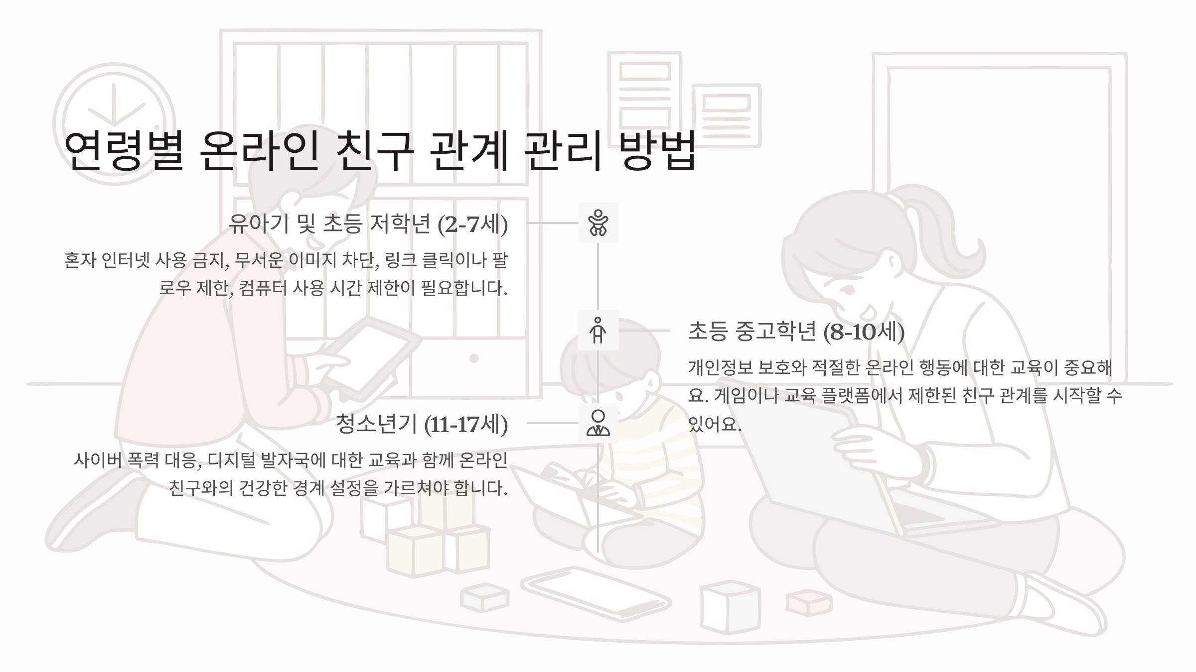 이 시기에는 개인정보 보호와 적절한 온라인 행동에 대한 교육이 중요해요. 게임이나 교육 플랫폼에서 제한된 친구 관계를 시작할 수 있지만, 반드시 부모님의 승인과 감독 하에 이루어져야 합니다.