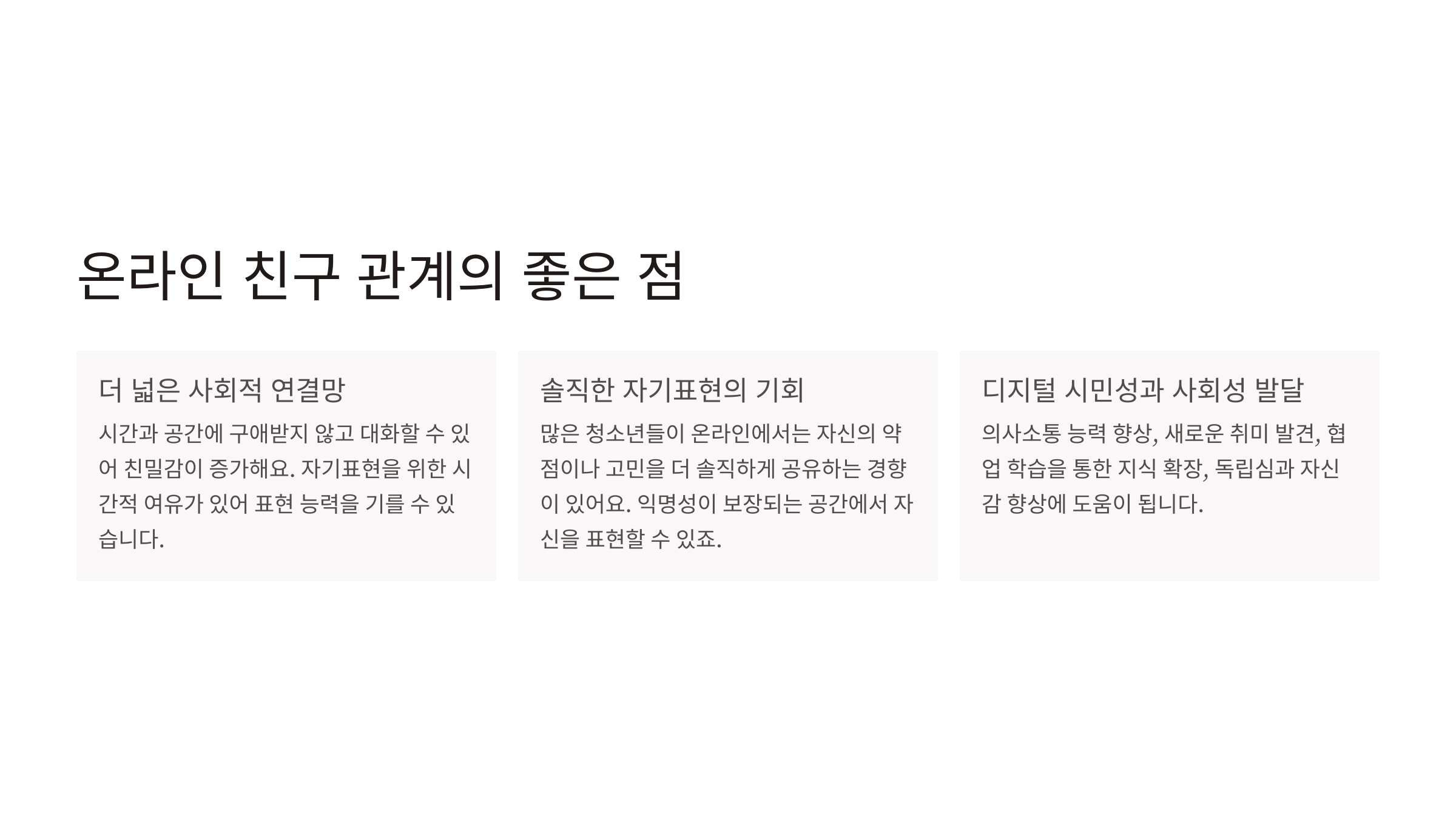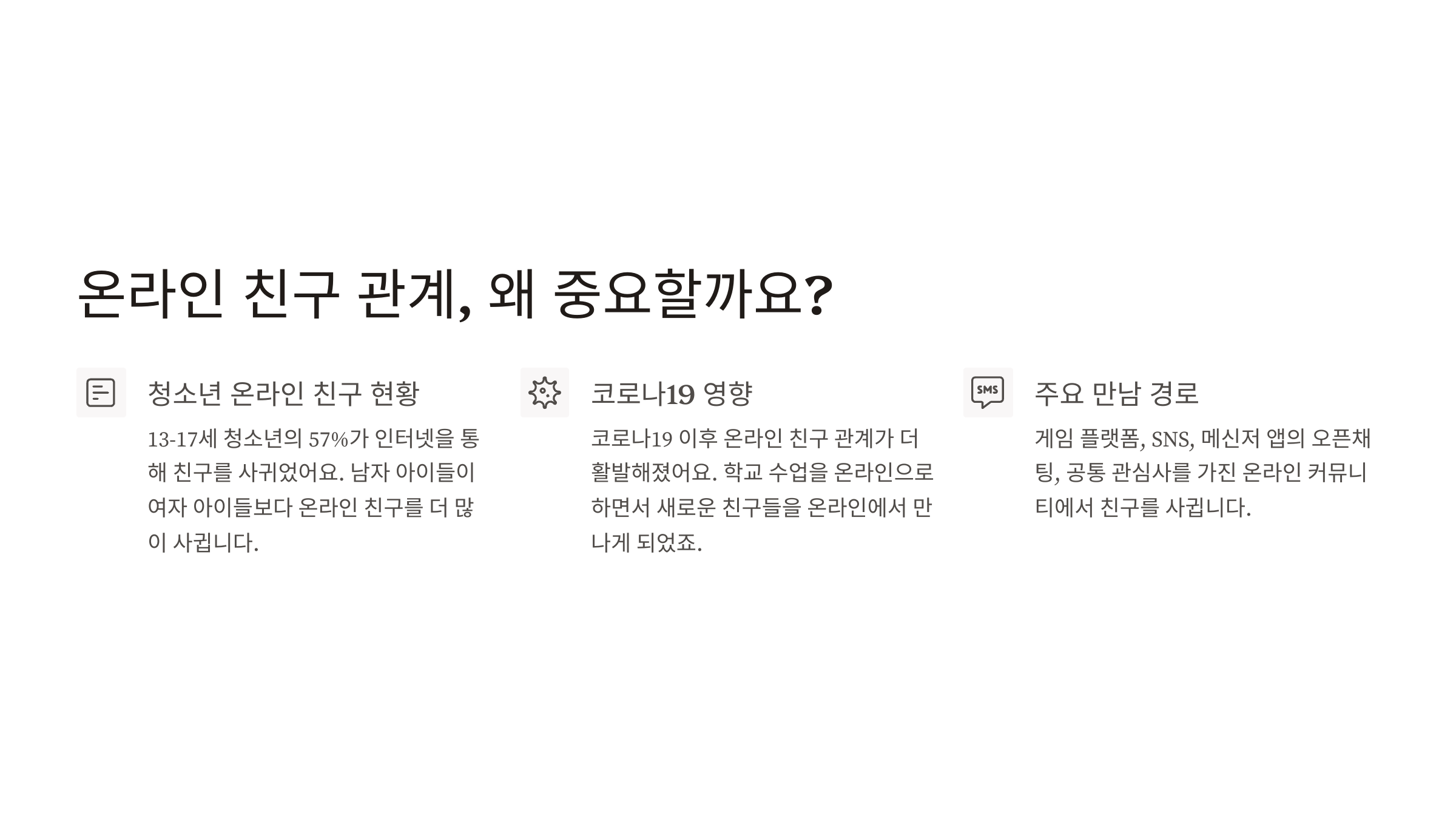 "SNS나 인터넷에서 좋아하는 음악이나 영화 드라마와 같은 공통 관심사를 찾는 것은 매우 쉽고, 그룹 채팅을 하다 보면 금방 친해지고 저의 절친한 친구를 만들 수 있었어요."라는 청소년의 이야기처럼, 온라인은 비슷한 취향과 관심사를 가진 또래를 쉽게 만날 수 있는 공간이 되었습니다.