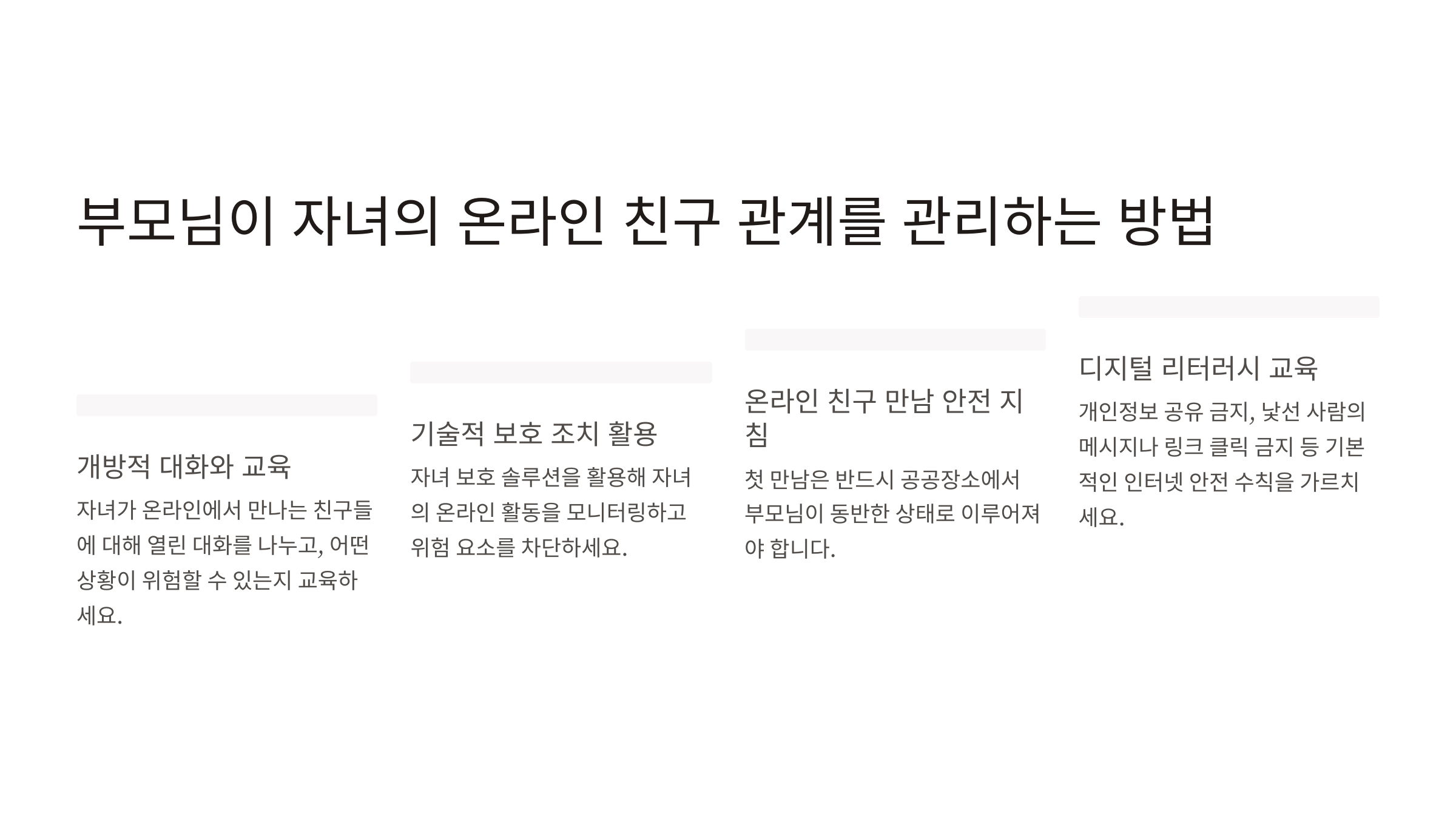 이를 통해 우리 아이들은 온라인 친구 관계의 좋은 점은 누리면서도 잠재적 위험으로부터 자신을 보호할 수 있는 능력을 기를 수 있을 거예요.