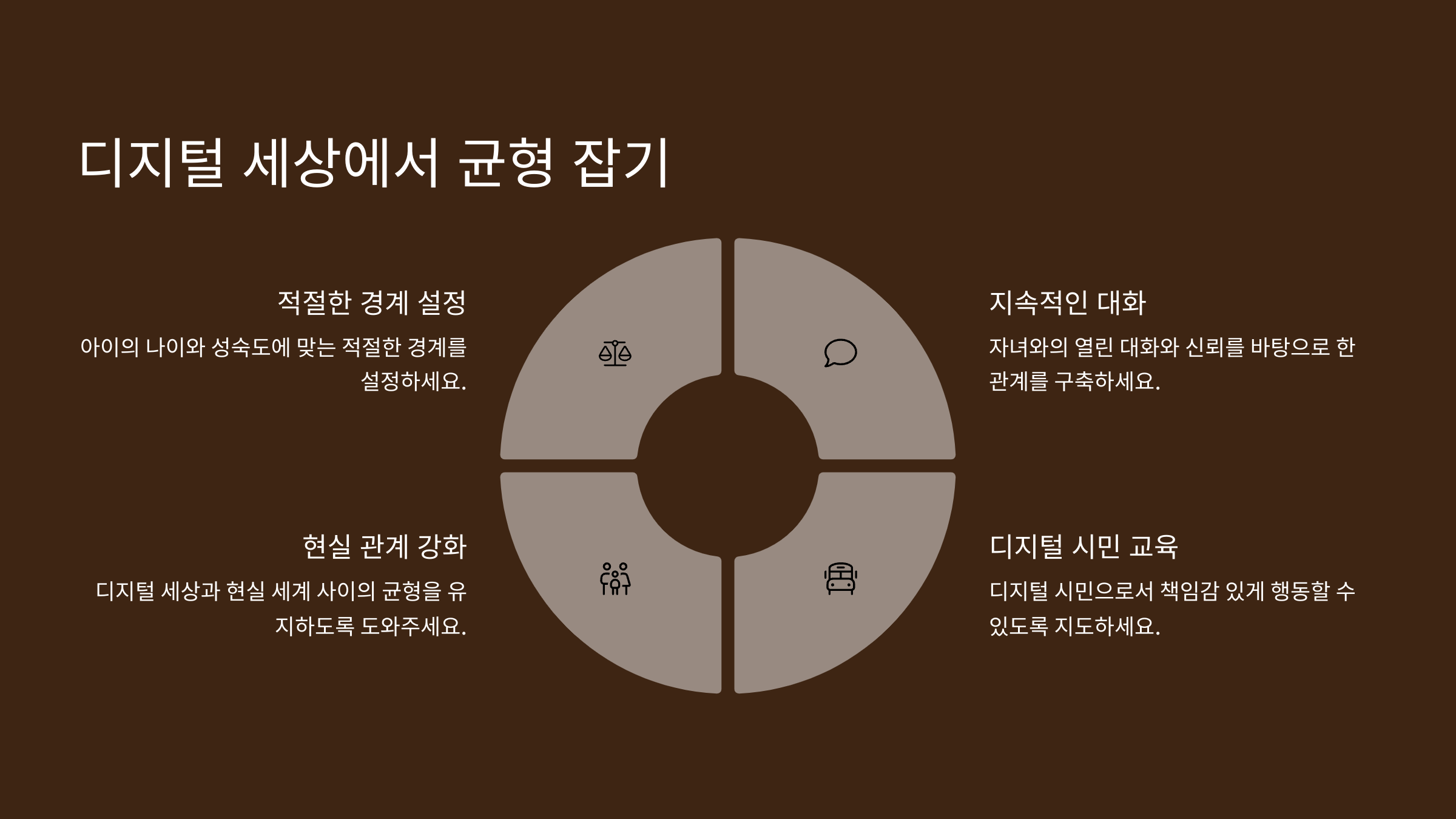 결국 부모님의 역할은 자녀의 온라인 활동을 과도하게 통제하기보다는, 디지털 시민으로서 책임감 있게 행동할 수 있도록 지도하고 지원하는 것입니다. 디지털 세상과 현실 세계 사이의 균형을 유지하며, 자녀와의 열린 대화와 신뢰를 바탕으로 한 관계를 구축하는 것이 무엇보다 중요합니다.