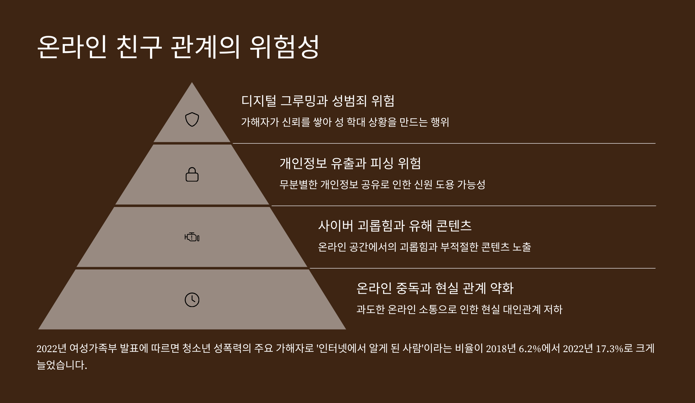 온라인 친구 관계에서 가장 심각한 위험은 성범죄 위험입니다. '아동 그루밍'이란 가해자가 아동·청소년과 신뢰와 우정을 쌓아 궁극적으로 성 학대를 할 수 있는 상황을 만드는 행위를 말해요.