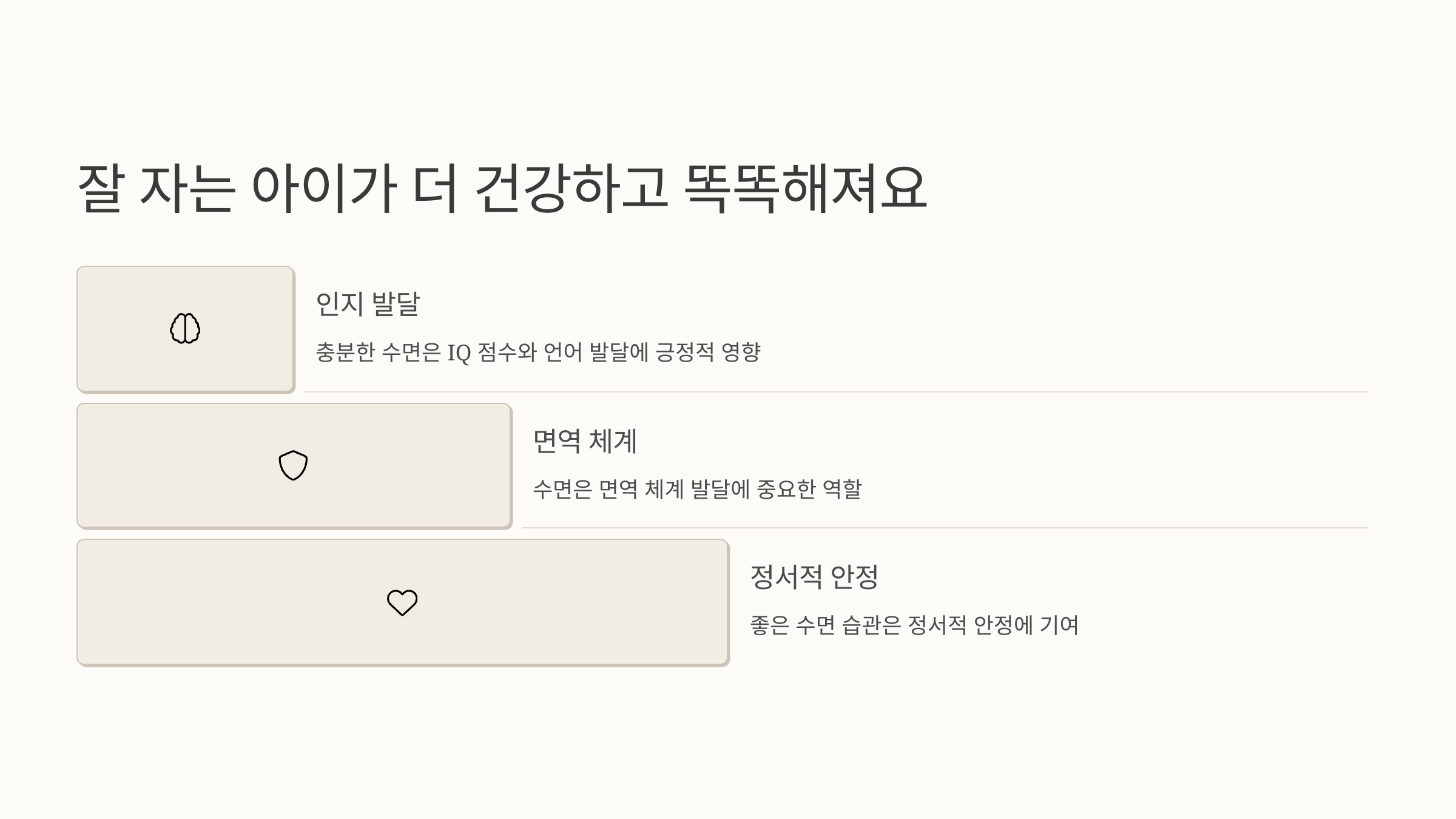 아이들의 수면 시간과 수면의 질은 단순히 휴식의 문제가 아니라 인지 발달과 학습 능력에 직접적인 영향을 미치는 중요한 요소예요. 연구 결과에 따르면, 충분한 수면을 취하는 아이들은 IQ 점수가 더 높고, 언어 발달과 인지 기능이 더 우수한 것으로 나타났어요.