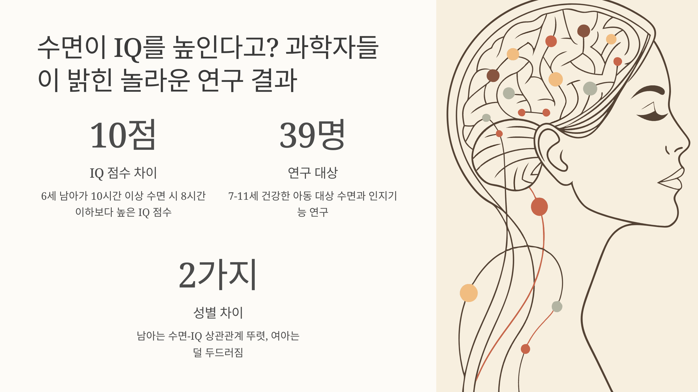 최근 연구들은 아이들의 수면 시간과 질이 인지 발달과 지능에 직접적인 영향을 미친다는 사실을 뒷받침하고 있어요. 서울대학교 의과대학 환경보건센터의 연구에 따르면, 6세 남아의 경우 8시간 이하로 수면을 취한 경우보다 10시간 이상 수면을 취했을 때 IQ 점수가 무려 10점이나 높게 나타났다고 해요.