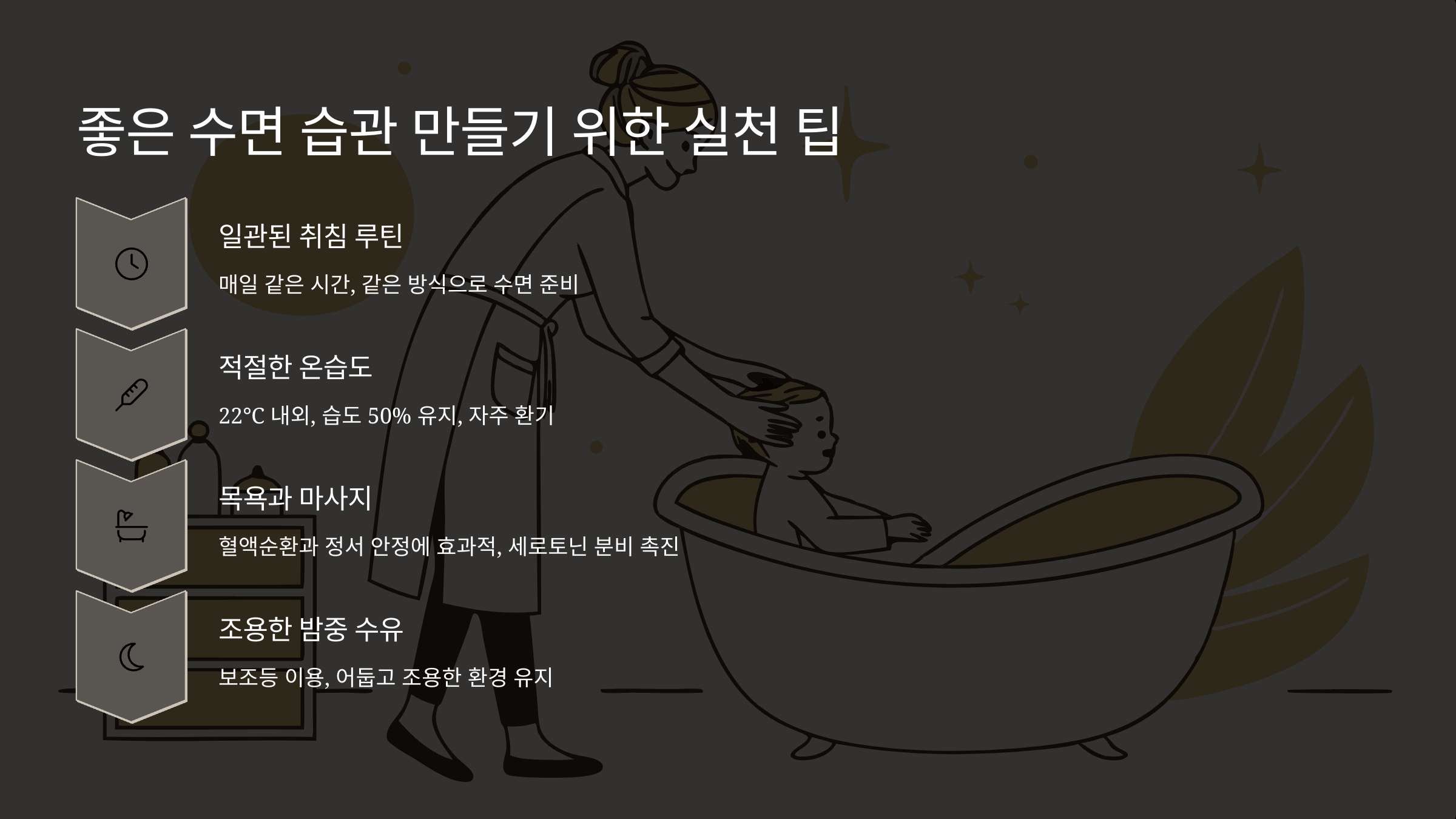 - 목욕과 마사지의 활용: 저녁 시간의 목욕은 혈액순환과 정서 안정에 효과적이어서 숙면에 도움이 돼요. 목욕 후 가벼운 마사지는 세로토닌 분비를 촉진하여 정서적 안정과 숙면에 도움을 준답니다.